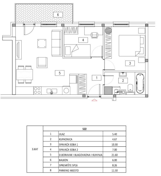 Stanovi su dvosobni, trosobni i četverosobni, a svakom stanu namijenjeno je spremište te parkirno mjesto.