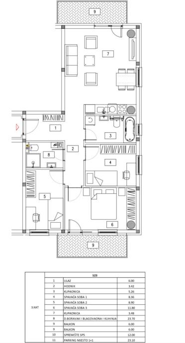 Stanovi su dvosobni, trosobni i četverosobni, a svakom stanu namijenjeno je spremište te parkirno mjesto.