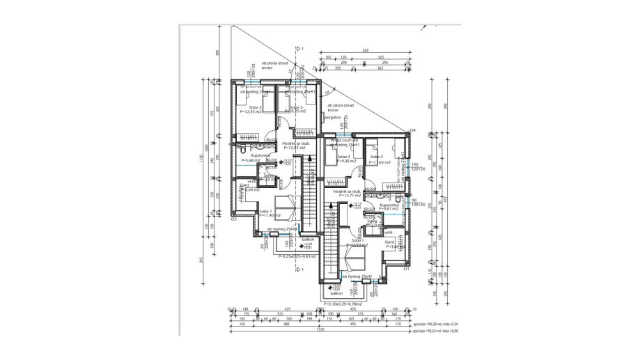 Ukupna površina stana je 122 m2, od čega je prizemlje 64 m2 koje se sastoji od dnevnog boravka, kuhinje i blagovaonice u jednom prostoru sa izlazom na terasu, te kupaonica i ostave, a na katu u tlocrtu od 59 m2 su tri spavaće sobe, od kojih jedna sa garderobom i balkonom i vešeraj.