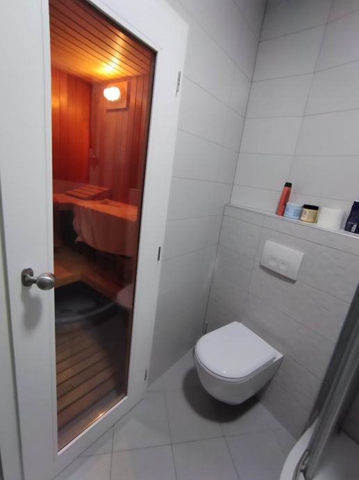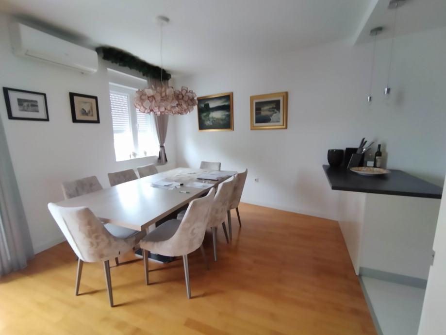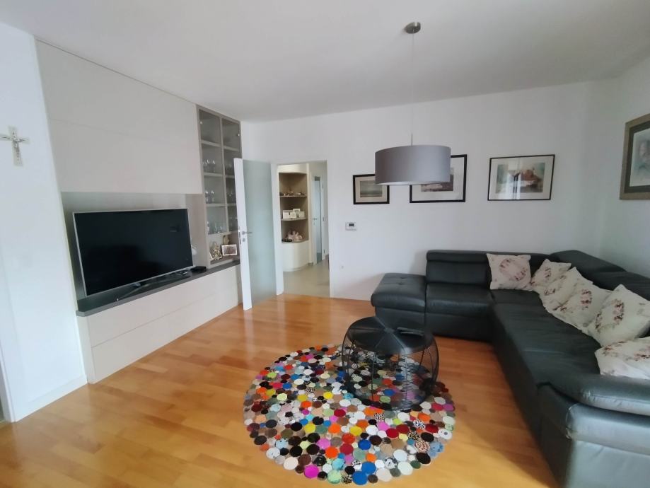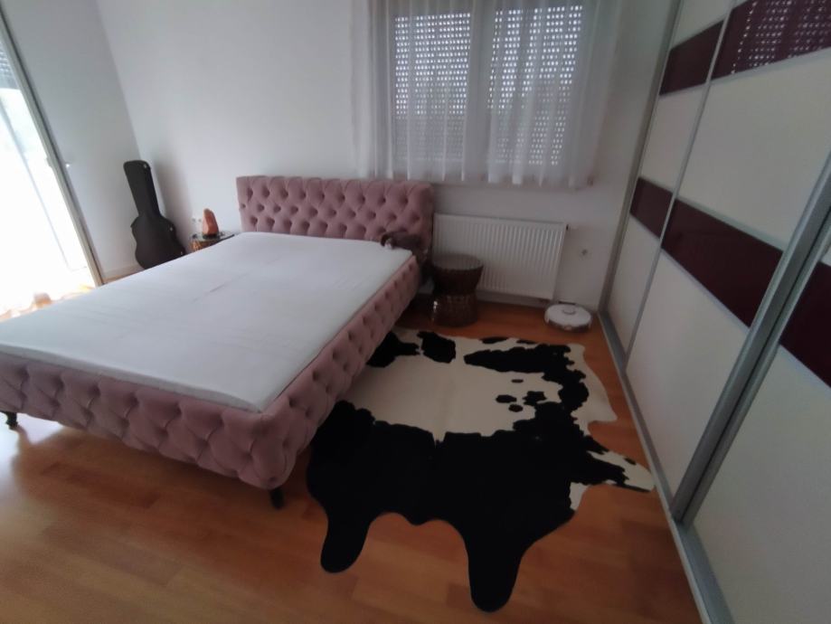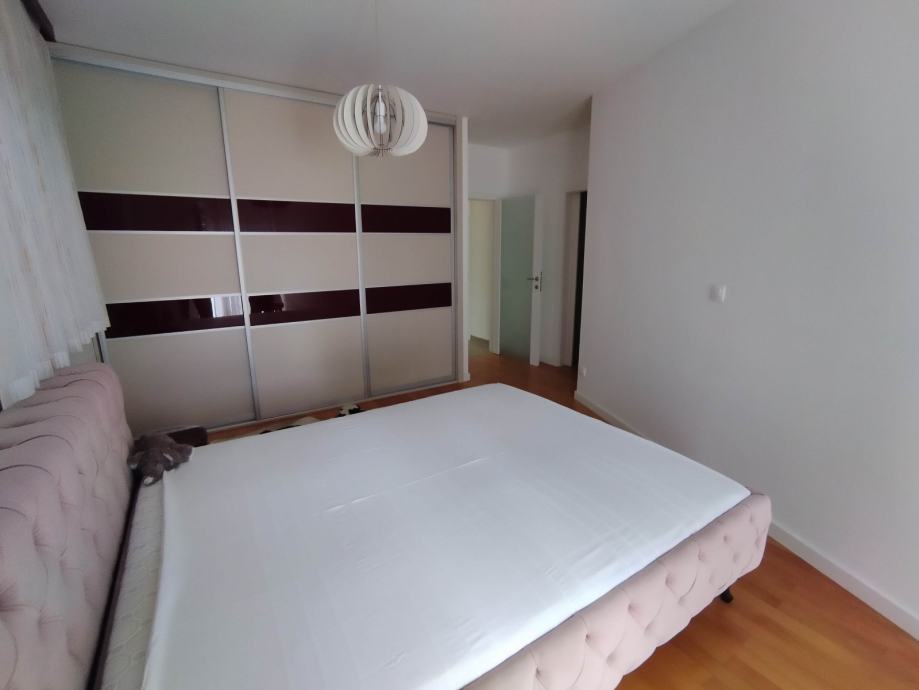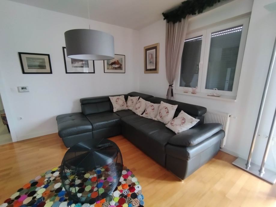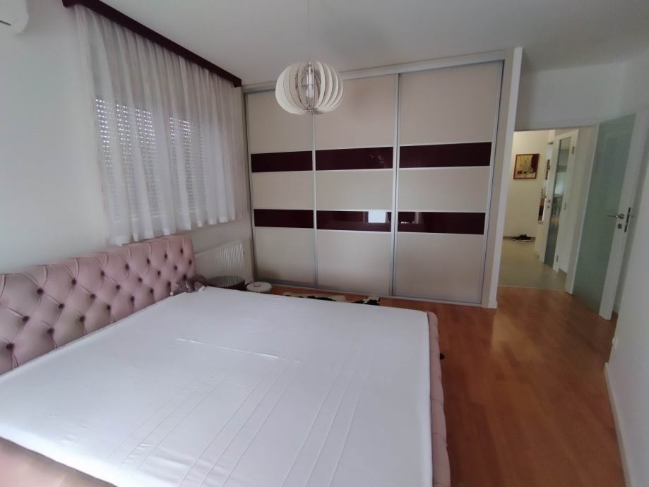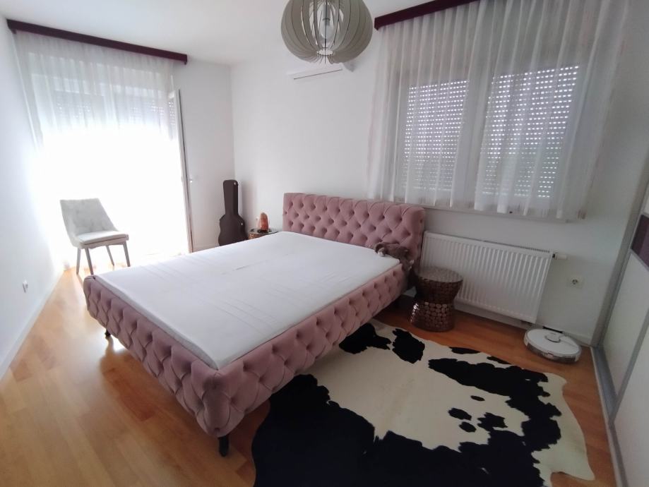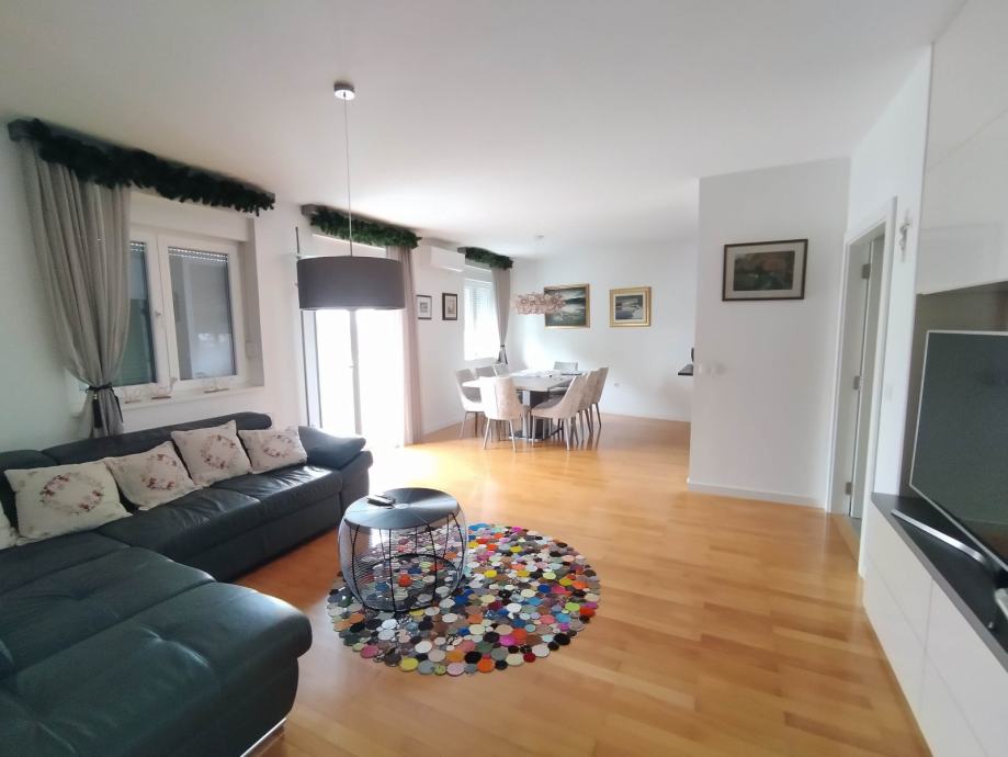 Prodaje se lijep, nov, komforan i kompletno namješten četverosobni stan u novogradnji u centru grada na lijepoj i mirnoj lokaciji. Stan se sastoji od dva hodnika, dnevnog boravka, kuhinje sa blagovaonicom i izlaza na balkon, te tri sobe, ostave, dvije kupaonice od kojih jedna ima saunu. U prizemlju zgrade se nalazi pripadajuća garaža i još jedna ostava. Stan se prodaje kompletno namješten.