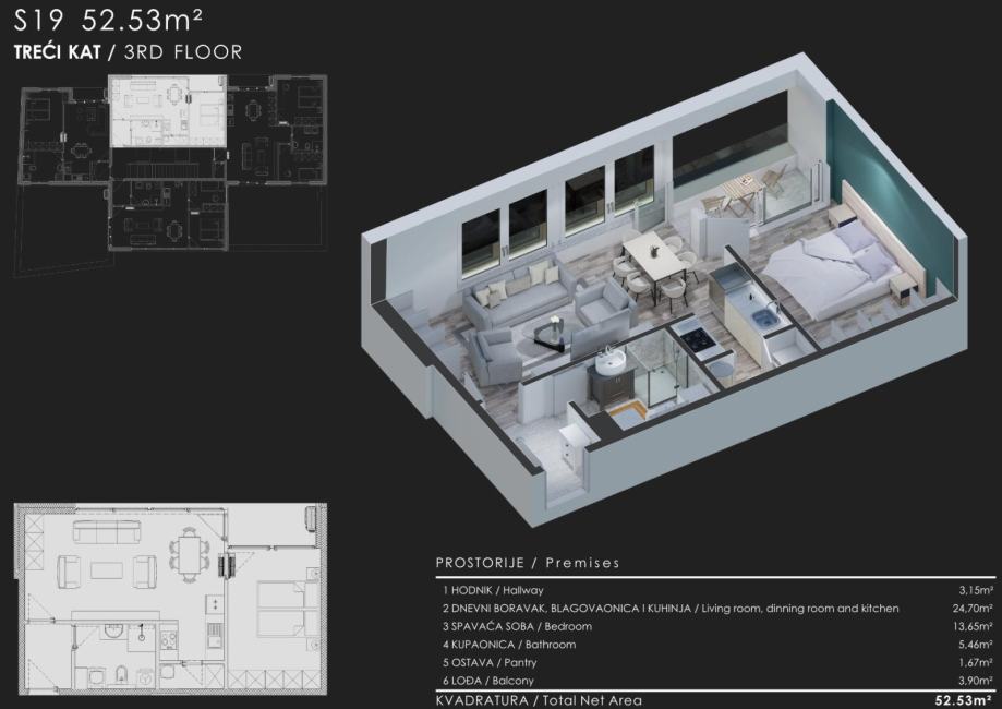 Svaki stan ima osigurano parkirno mjesto koje ne ulazi u kvadraturu stana i kupuje se odvojeno od stana.