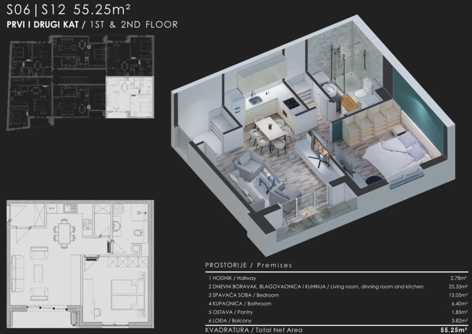 sastoji se od hodnika, dnevnog boravka sa blagovaonicom i kuhinjom, kupaonice, spavaće sobe, lođe i ostave, površine 55.25 m2. Nalazi se na južnom dijelu zgrade. Stan je na uličnoj strani zgrade.