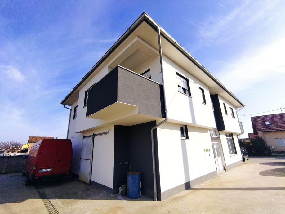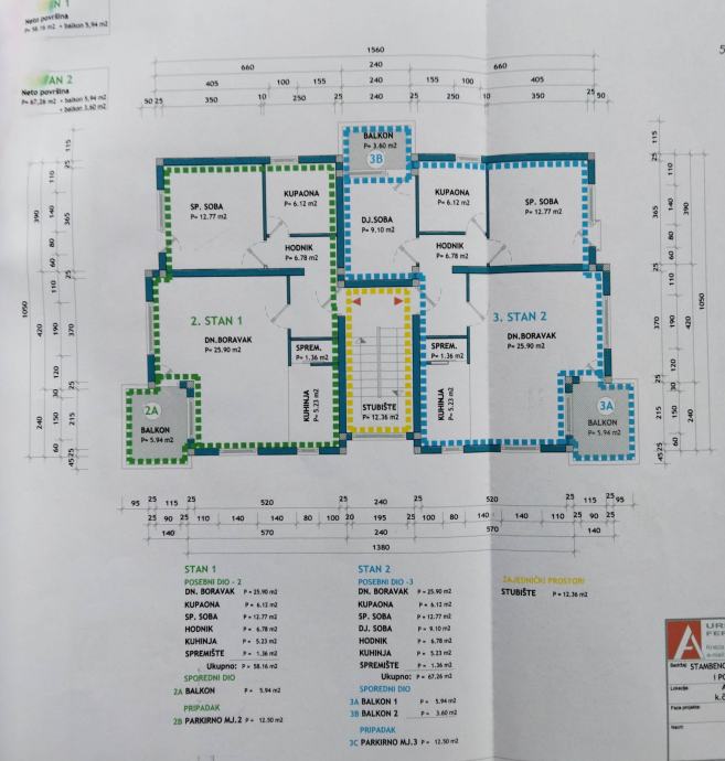 STAN 2 smješten na katu stambeno poslovne zgrade, označen u etažnom elaboratu svijetloplavombojom, koji se sastoji od:KAT - dnevnog boravka 25,90 m2, kupaone 6,12 m2, sp. sobe 12,77 m2, dj. sobe 9,10 m2, hodnika6,78 m2, kuhinje 5,23 m2 i spremišta 1,36 m2; ukupno: 67,26 m2;sa sporednim dijelom: 3A - natkr. balkon 1 površine 5,94 m2, 3B - natkr. balkon 2 površine 3,60 m2i pripadkom: 3C - parkirno mjesto 3 površine 12,50 m2, ukupno: 22,04 m2.sveukupno STAMBENA JEDINICA BR. 2 površine 89,30