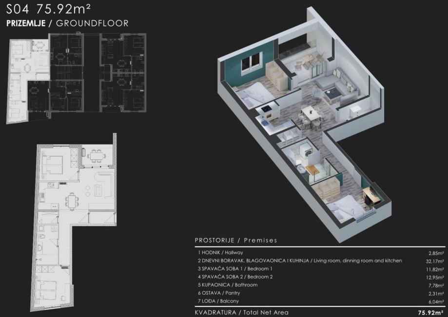 sastoji se od dnevnog boravka sa blagovaonicom i kuhinjom, kupaonice,dvije spavaće sobe, lođe i ostave,površine 75.92 m2. Orijentacija stana je sjever - jug.