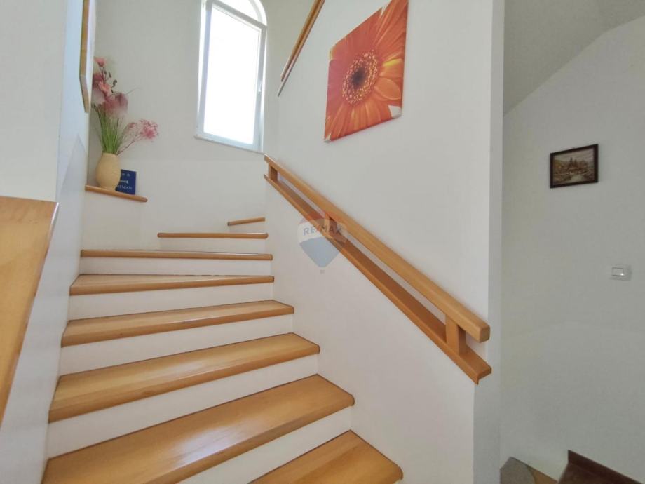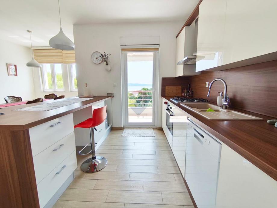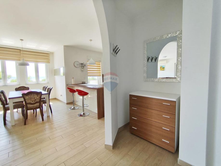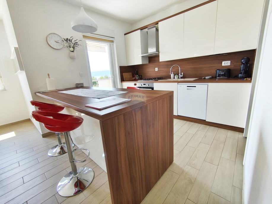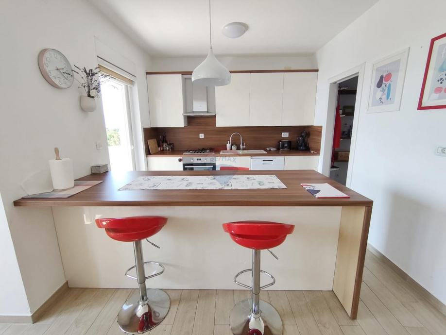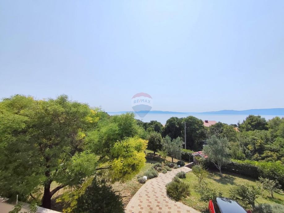 Na prvom katu obiteljske kuće nalazi se uređen i svijetao stan od 105 m² s velikom terasom i prekrasnim pogledom na more.