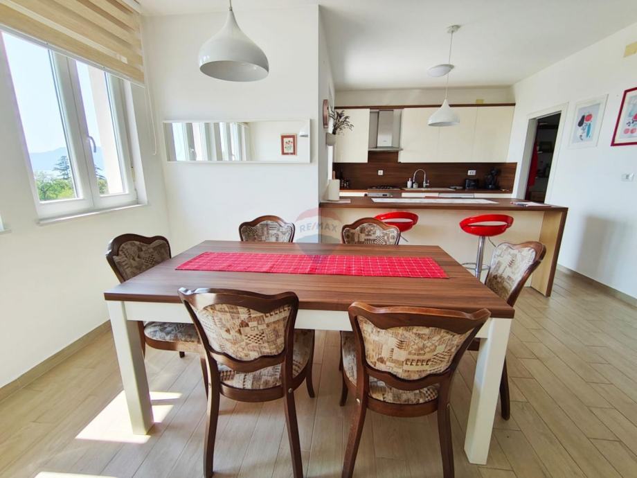 U srcu mirne i prestižne Kostrene, na prvom katu pažljivo održavane obiteljske kuće s njegovanim vrtom, video nadzorom i električnom kapijom, nalazi se stan koji spaja prostranost, funkcionalnost i mediteranski ugođaj.