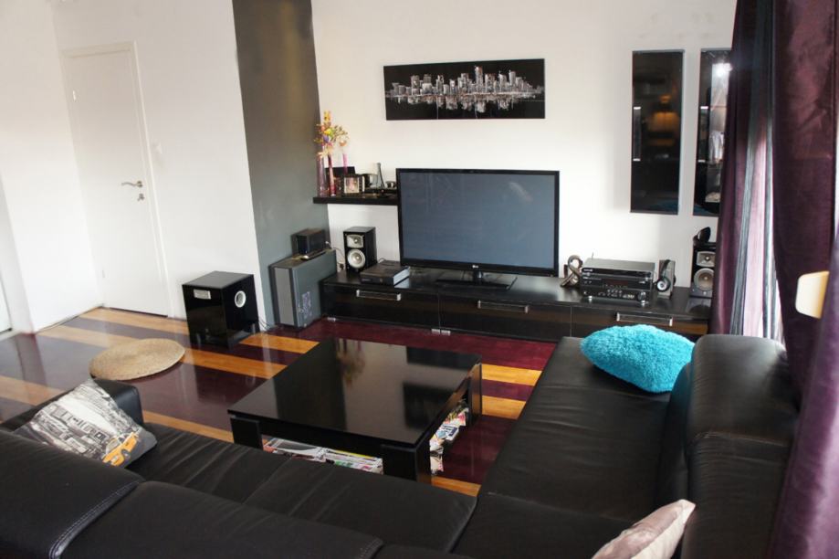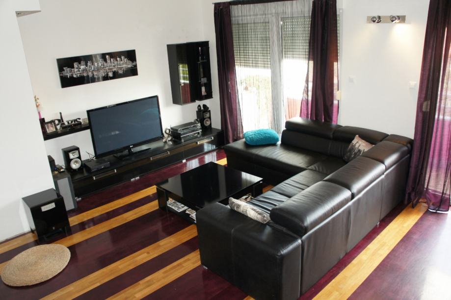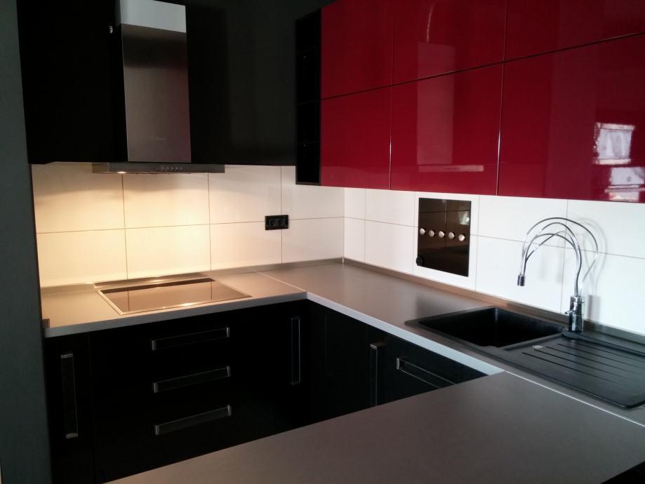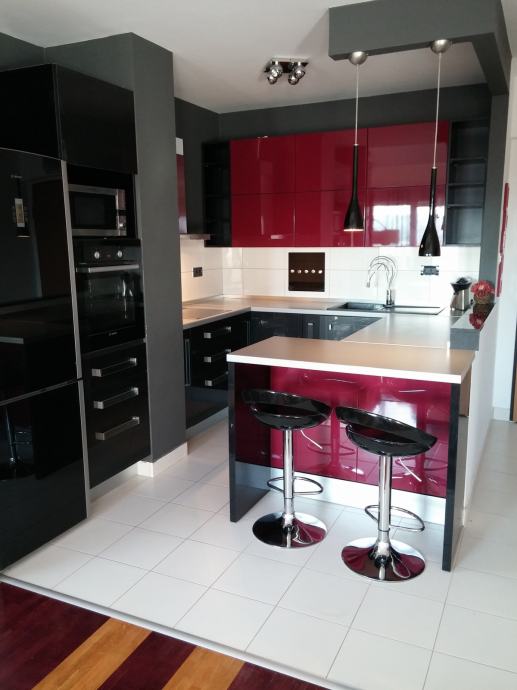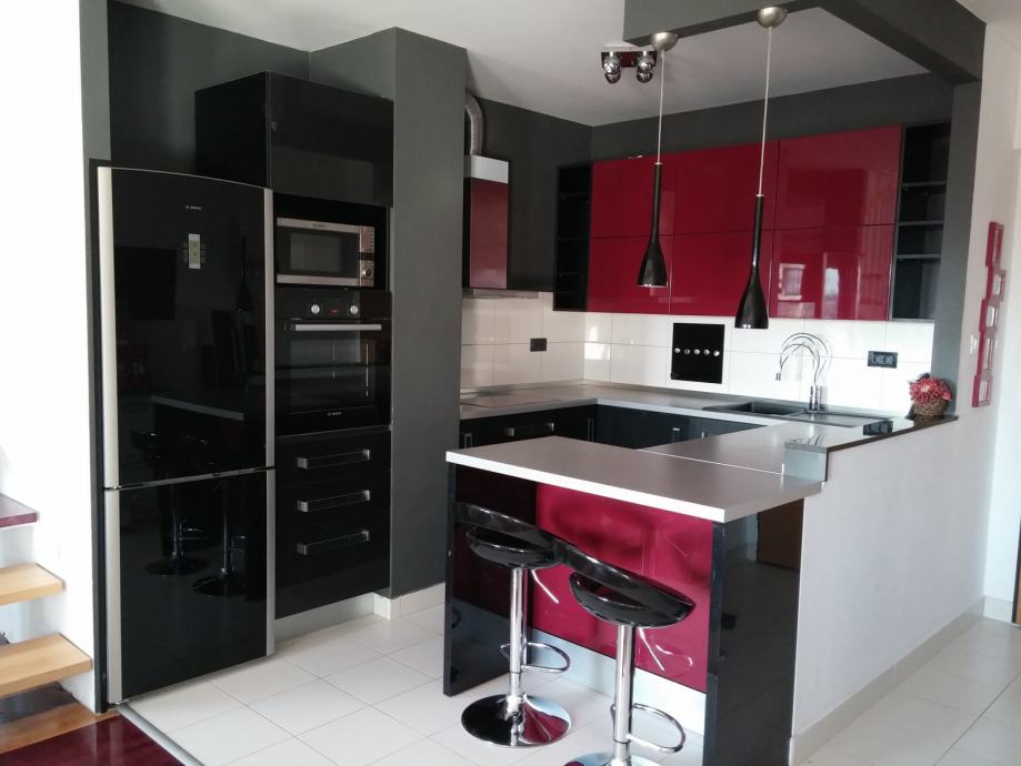 Prilikom uređenja, vodilja nam je bio minimalistički stil u kombinaciji crne, bordo i natur boje drva. Poseban naglasak je stavljen na uređenje moderne i praktične kuhinje. Ravnih linija, odlične funkcionalnosti U oblika, opremljena je crnom indukcijskom pločom za kuhanje, crnim staklenim hladnjakom, crnim granitnim sudoperom, inox/staklenom napom, perilicom posuđa... Bordo vratnice visećih elemenata su napravljene od lakiranog medijapana, dok je ostatak od crnog sjajnog akrila. Poseban šarm kuhinji daje i široki šank s dvije barske stolice, a može poslužiti za brzi obrok ili za ugodno druženje.