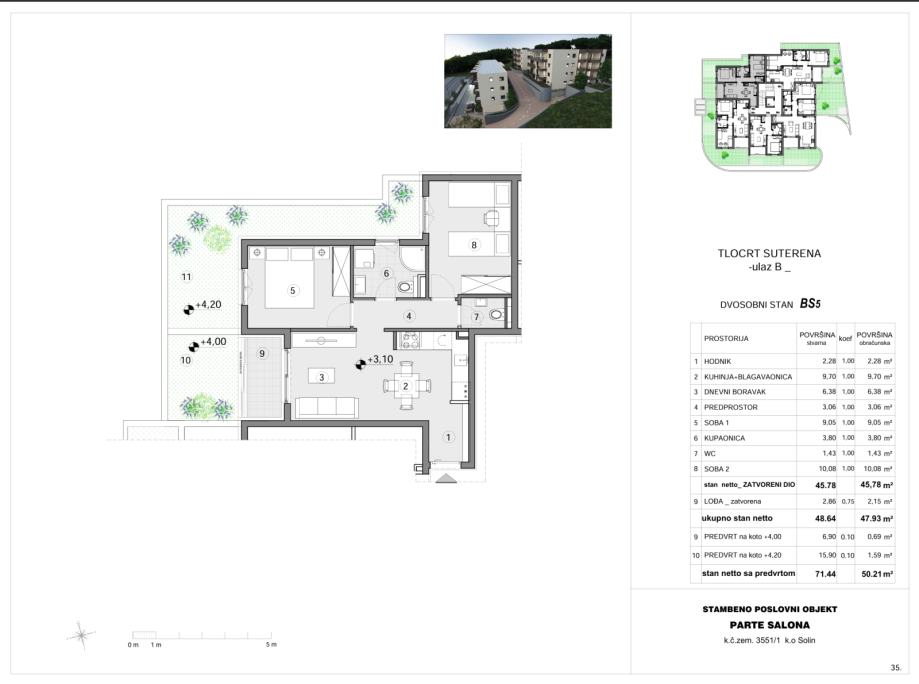 Dvosoban stan zapadno orjentiran, podne površine 50,21 kvadrata, sa pripadajućim garažnim mjestom, te vrtom od 22,80 kvadrata.