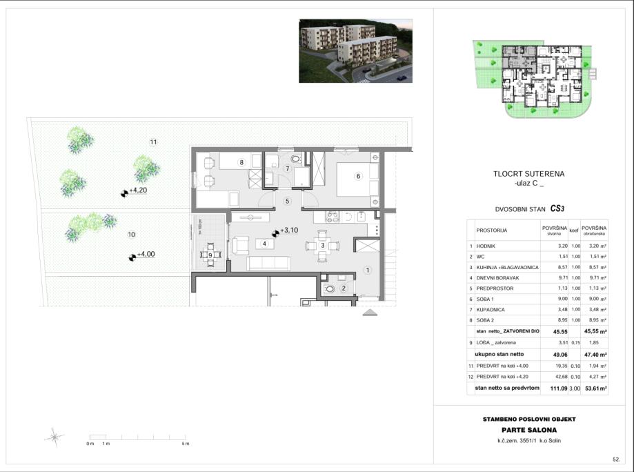 Dvosoban stan, zapadno orjentiran, podne površine 49,06 kvadrata, sa pripadajućim garažnim mjestom i vrtom od 111,09 kvadrata.