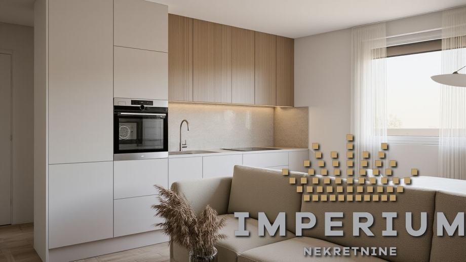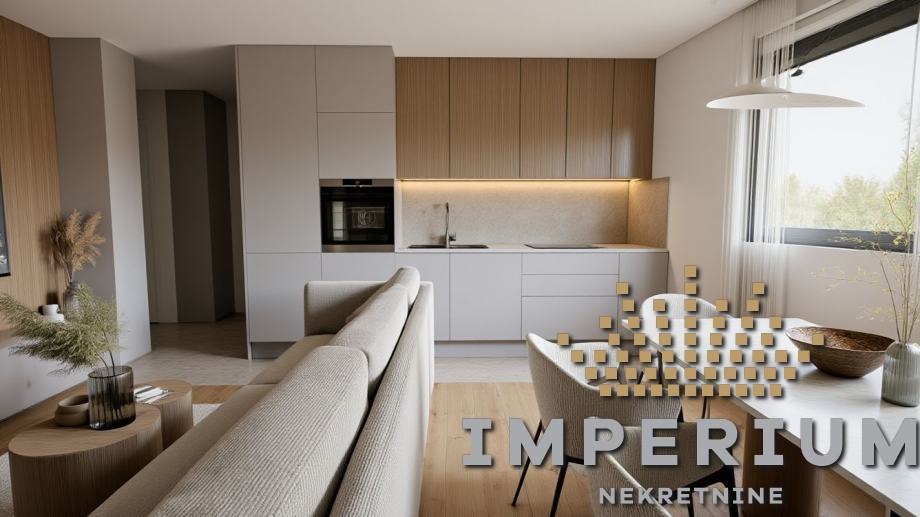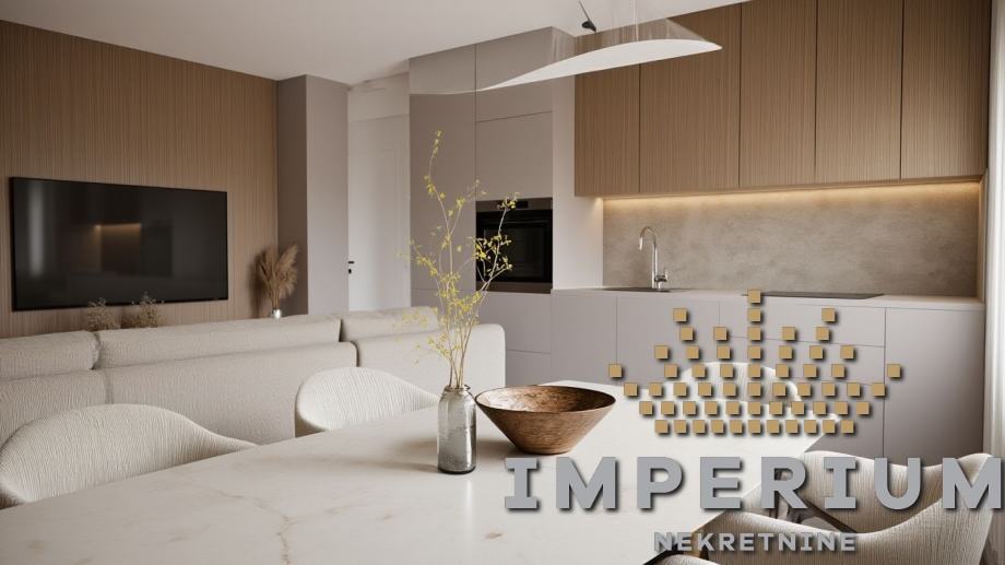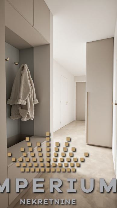 Stan se sastoji od ulaznog dijela, dvnevnog boravka, kuhinje s blagavaonom, tri spavaće sobe i kupatila.