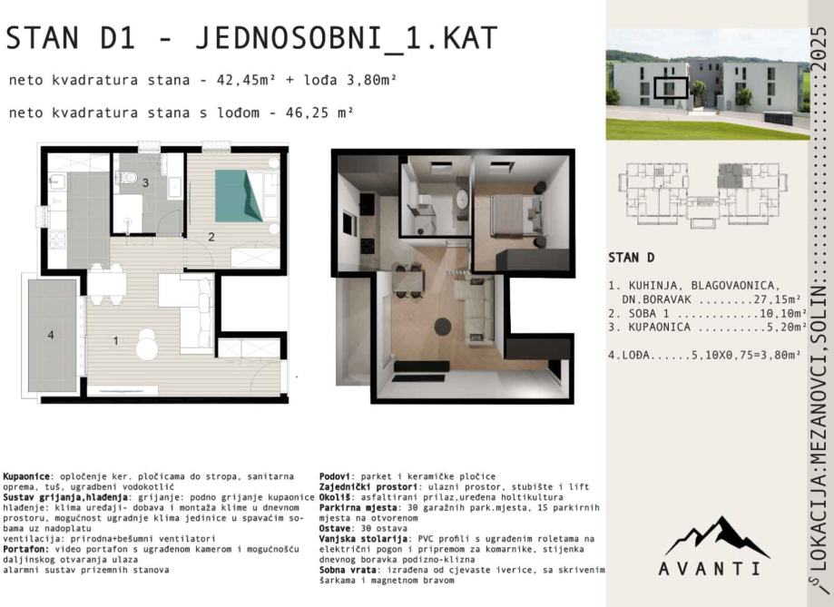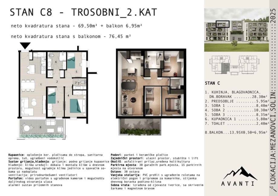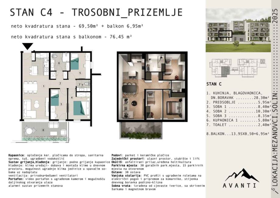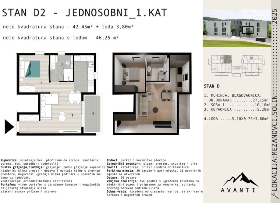 Prodajemo stanove u novoj višestambenoj zgradi na atraktivnoj lokaciji u Mezanovcima, Solin — s nesmetanim pogledom i jugozapadnom orijentacijom koja osigurava obilje prirodnog svjetla tijekom cijelog dana.