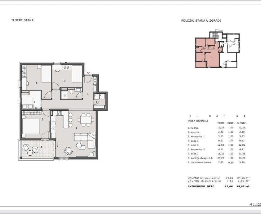 Stan ima svoje parkirno mjesto u garaži , a postoji mogućnost kupnje i ostave. Zgrada se radio po vrlo visokom standardu, kao što je