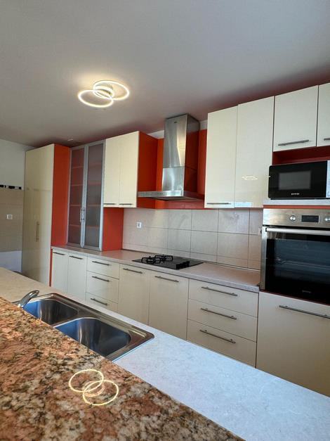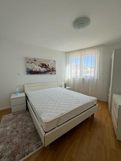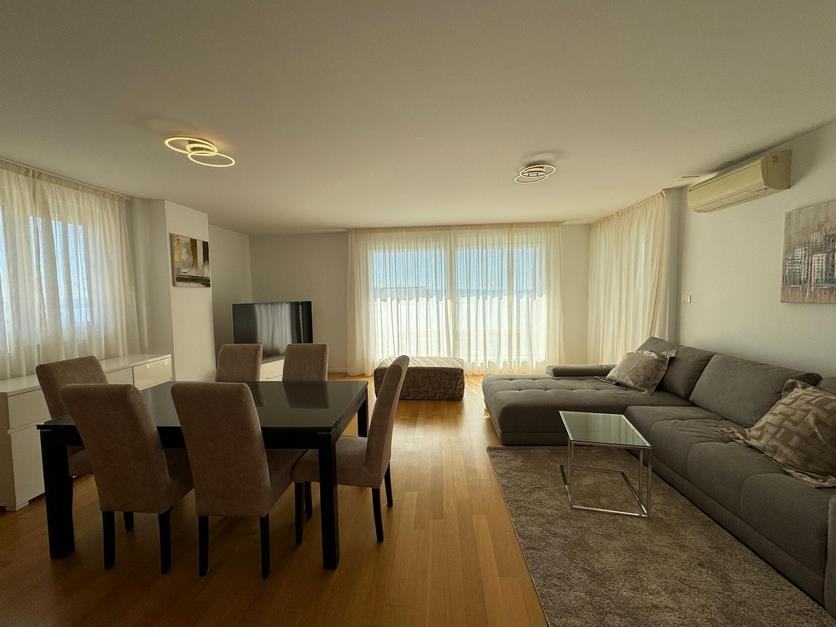 Iznajmljujemo moderno opremljen stan na lijepoj i mirnoj lokaciji. Stambena površina stana iznosi 102 m2. Smješten je na 4. katu (penthouse) manje zgrade s liftom.