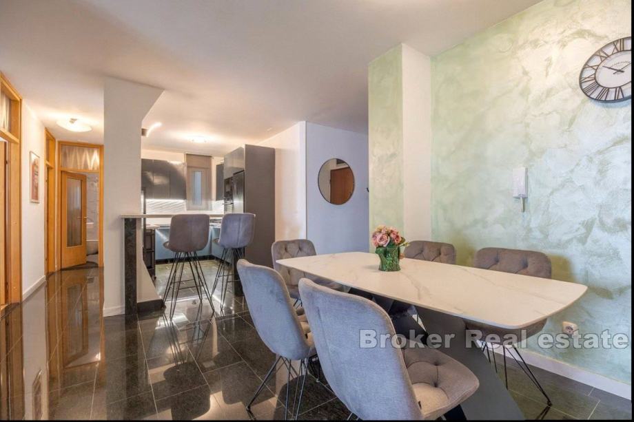 Sastoji se od tri spavaće sobe, dvije kupaonice, zasebnog wc-a, prostranog dnevnog boravka, kuhinje s blagovaonicom, hodnika te lođe. Stan se prodaje namješten i spreman je za useljenje. Pripada mu i drvarnica u zgradi.