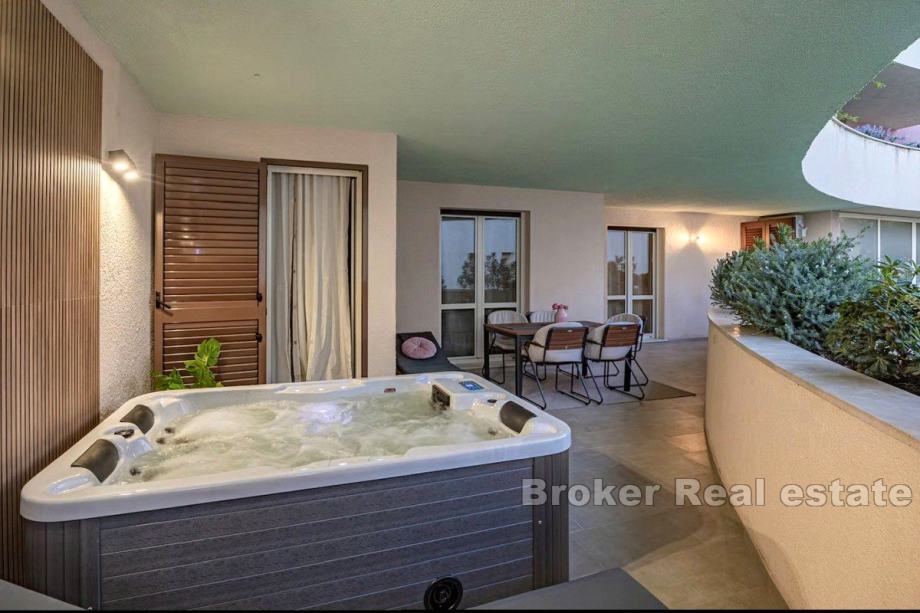 More je udaljeno svega 130 metara, a u neposrednoj blizini nalaze se plaže, bolnica, sportski sadržaji, restorani, kafići, trgovine i svi ostali sadržaji potrebni za ugodan boravak ili cjelogodišnje stanovanje.