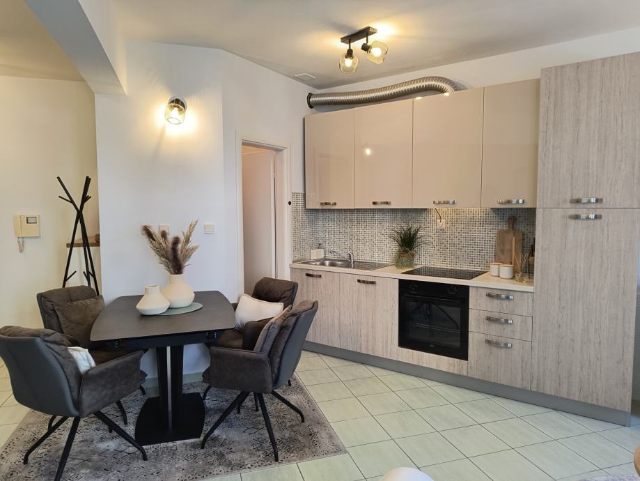 Kuhinja je u potpunosti opremljena (perilica posuđa, pećnica i svi potrebni uređaji), dok se u kupaonici nalazi perilica rublja. Grijanje i hlađenje osigurano je putem klima uređaja.