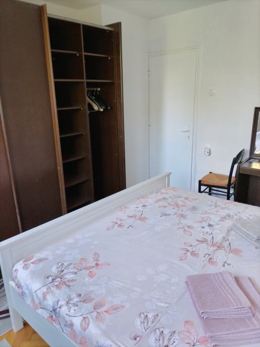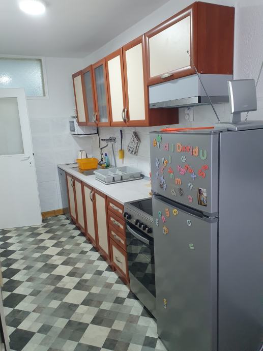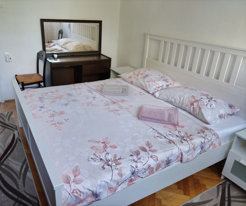 Dosoban stan ,potpuno namjesten, sa novom tehnikom: Tv,perilica rublja,perilica sudja,elektricni stednjak sa pecnicom, klima uredjaj, kuhalo za vodu, mikrovalna .U jednoj sobi je krevet sirok 1,6m u drugoj 1,8m.Pogledajte slike , jedino fali slika predsoblja u kojoj se nalazi ormar veliki sa ogledalom, vjesalicom i ormaricem za cipele.Stan ima i drvarnicu kao i zidne ormare.Kuhinja je namjestena,kompletna sa posudjem, stol okrugli sa 4 stolice i ugaona garnitura za sjedenje.Soba ima i pisaci stol,moze se nabaviti i za drugu sobu ako treba.Stan je u prizemlju,medjutim prozori od soba su podignuti 2,5m od zemlje.Sobe gledaju na mali park sa zelenilom lokalnog karaktera.Ulica je sporedna i nije prometna.Na 50 metara od stana nalazi se pijaca Skalice, mesnica,pekara,Konzum, frizerski i krojacki salon, praona i peglaona rublja.Kafic i rostiljnica je udaljena 100m.