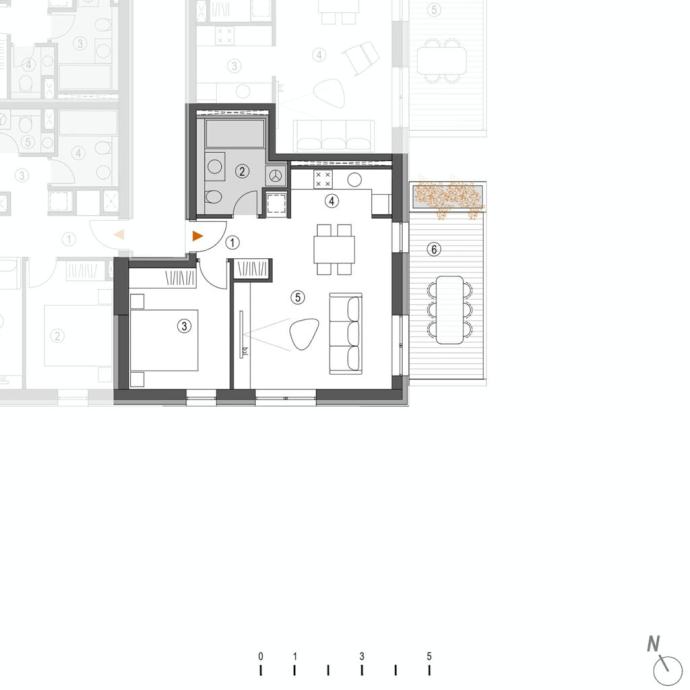 Sastoji se od prostranog otvorenog prostora kuhinje, blagovaonice i dnevnog boravka (25,94m2), spavaće sobe (10,97m2), hodnika (3,85m2), potpuno opremljene kupaonice (6,22m2) te natkrivenog balkona (12,49m2).