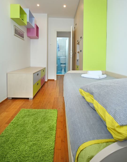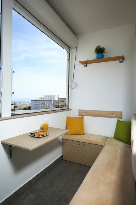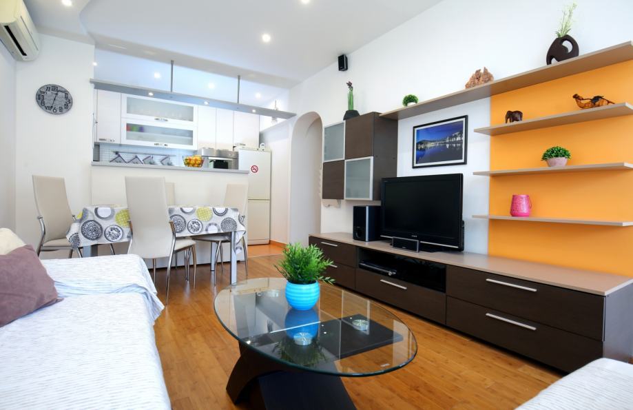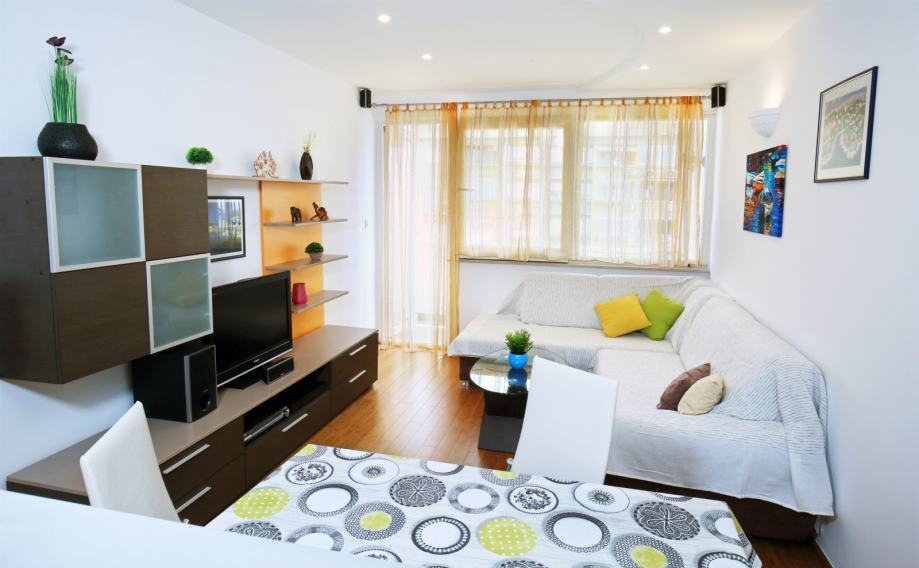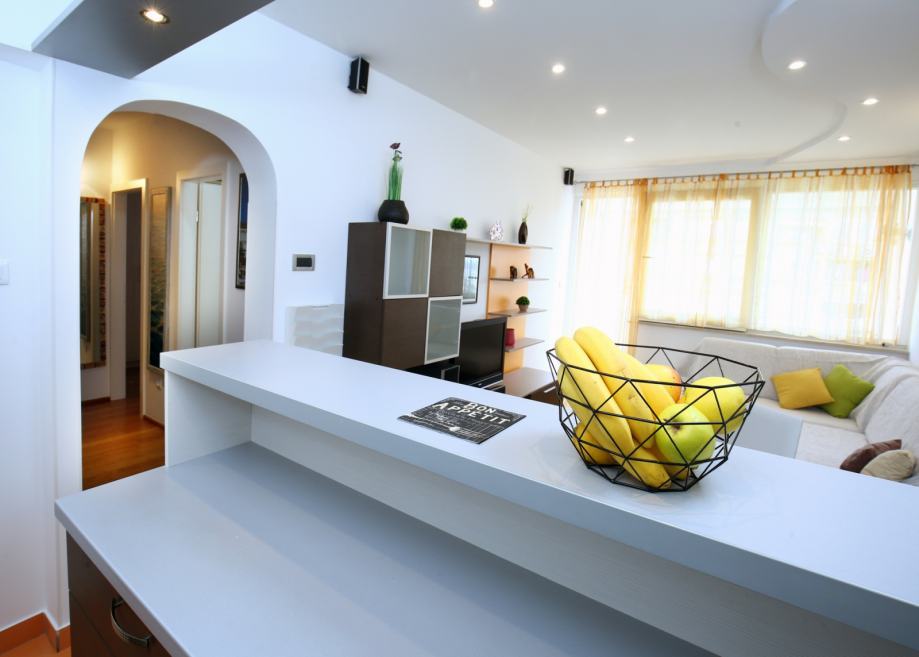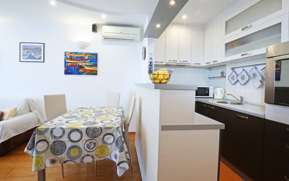 Stan površine 58 m² sastoji se od hodnika, dnevnog boravka s blagovaonicom, kuhinje, dvije spavaće sobe, kupaonice, manjeg WC-a i lođe. Kompletna renovacija stana obavljena je 2007. godine, kompletna nova hidro i termo izolacija stavljena iznad stana na terasi zgrade 2012. godine, te zadnja adaptacija za 4* apartman izvedena je 2018. godine, što osigurava dobro održavan i funkcionalan prostor.