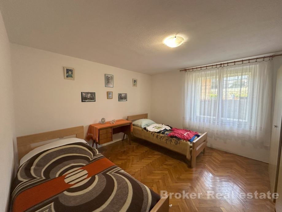 A two-bedroom apartment with a surface area of 60 m² is for sale, located on the ground floor of a residential building in a quiet area of the Mejaši neighborhood in Split. The apartment includes a 89 m² outdoor area, which the previous owners arranged as a garden, with part of the space designated for a private parking spot.