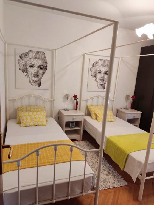Sastoji se od dvije spavaće sobe (1 bračni krevet, 2 kreveta za jednu osobu, (obje sobe imaju radni stol), wc-a s kadom, kuhinje, dnevnog boravka, spreme i dva balkona. Stan je u potpunosti opremljen i namješten.