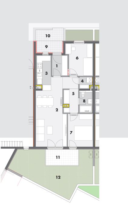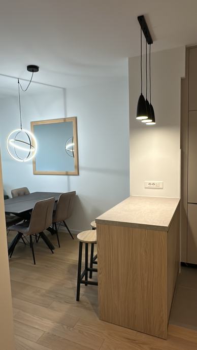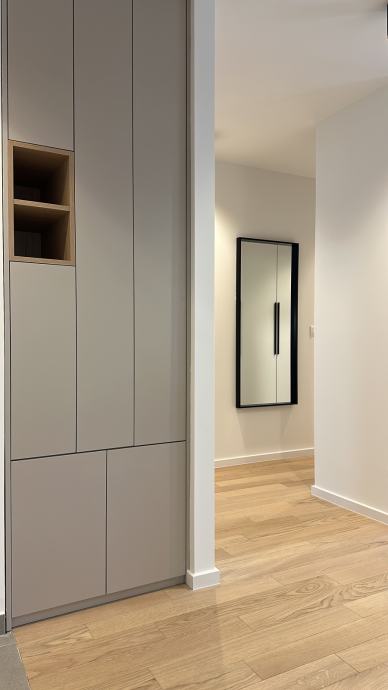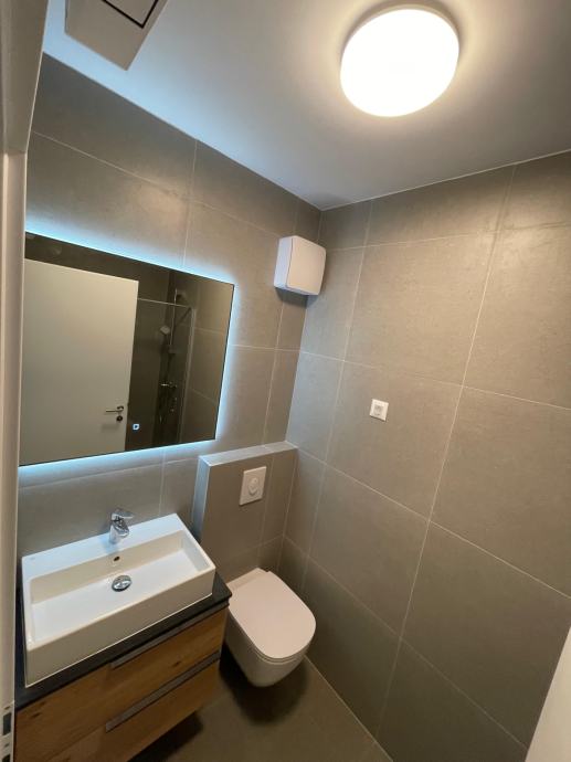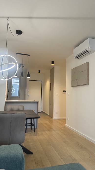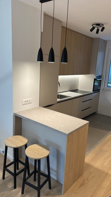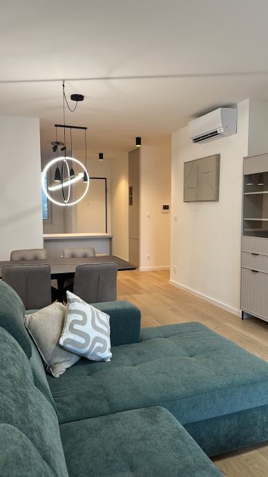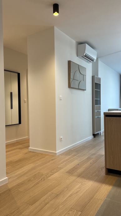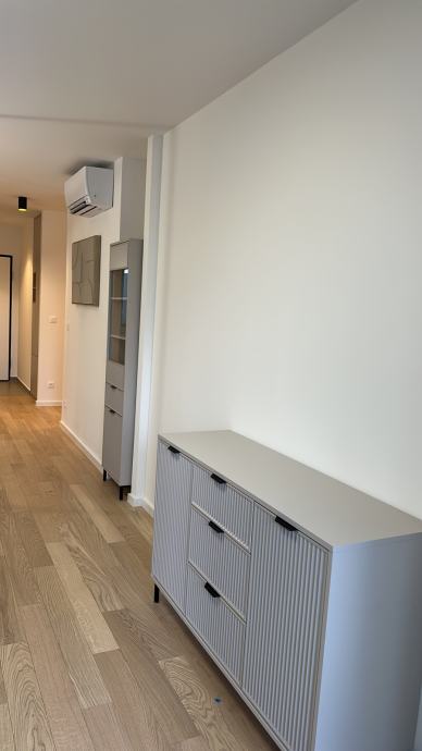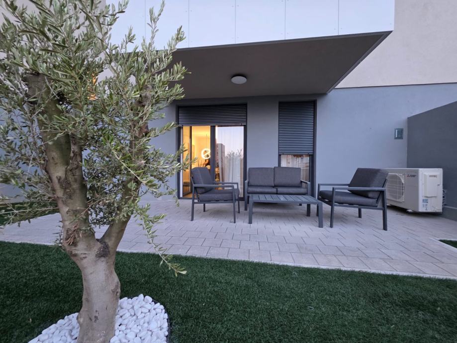 A modern two-bedroom apartment is available for long-term rent in Žnjan, in a new building from 2025 – first occupancy. The 64 m² apartment consists of an entrance hallway, two bedrooms, a bathroom, a utility room, as well as a kitchen, dining area, and living room with access to a south-facing terrace and garden. There is also an additional terrace at the entrance, with a total outdoor area of approximately 40 m².