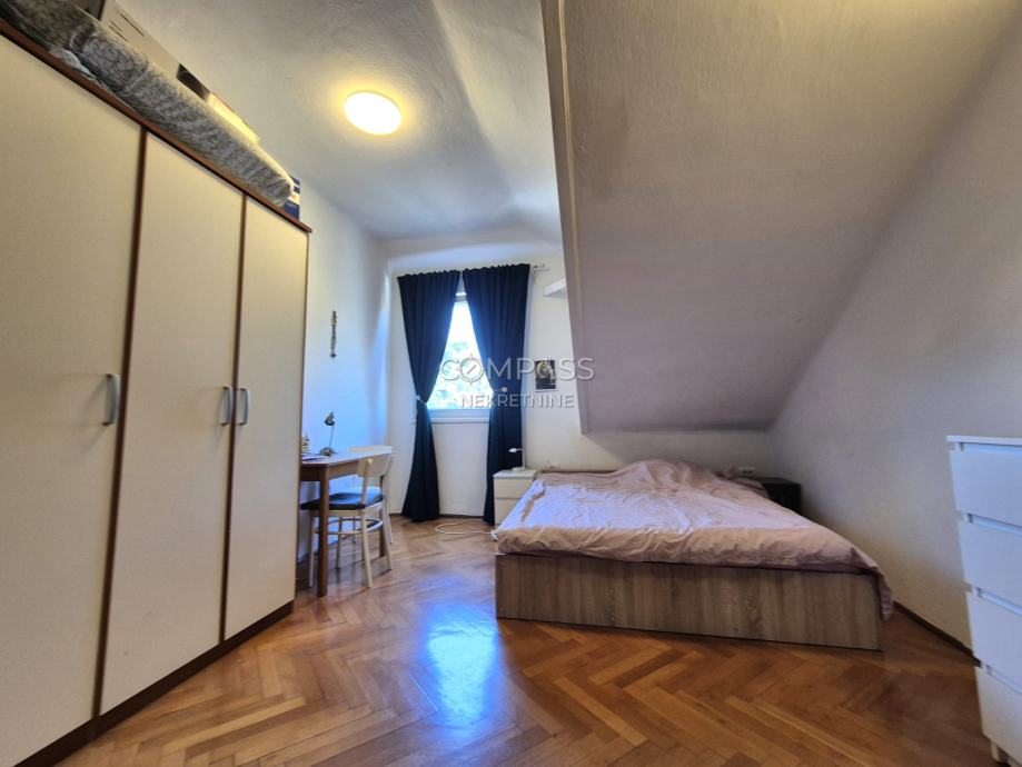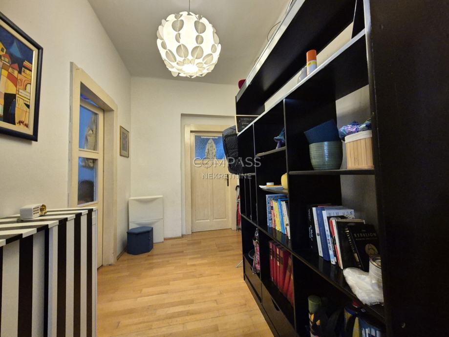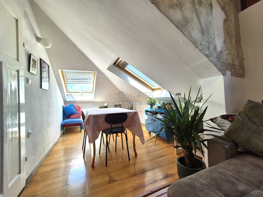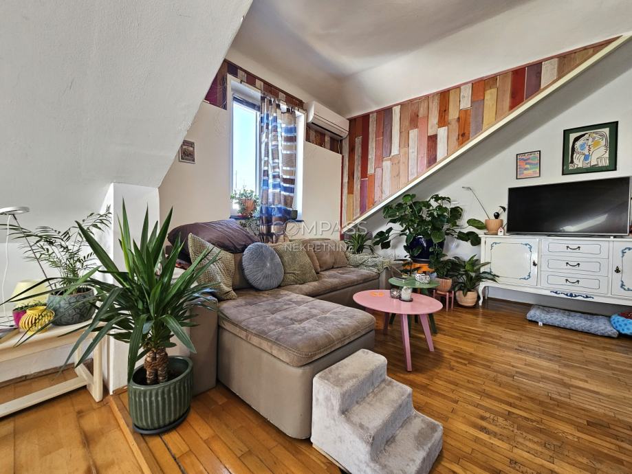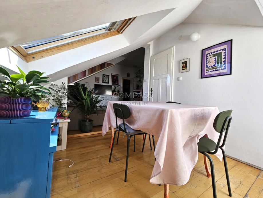 Stan se položen u potkrovlju kvalitetno održavane stambene zgrade iz 1920-ih godina, bez lifta, s prekrasnim starinskim stubištem. Kategoriziran je te ostvaruje odlične prihode u sezoni.