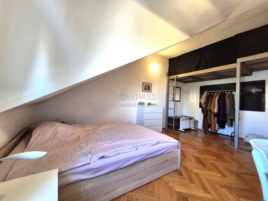 Leiligheten ligger på loftet i en godt vedlikeholdt bygård fra 1920-tallet uten heis, med en vakker, gammel trappeoppgang. Den er registrert for turistutleie, noe som gjør den ideell også som investering.