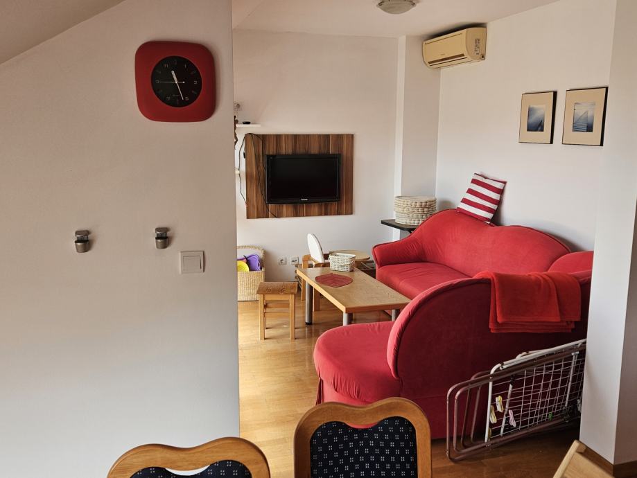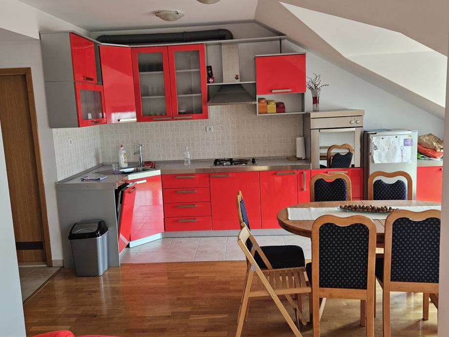 Sastoji se od kuhinje, blagavaonice,dnevnog boravka,3 spavaće sobe ( jedna mala u potkrovlju ),2 toaleta i 2 balkona.