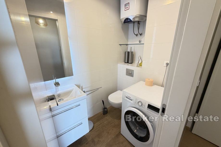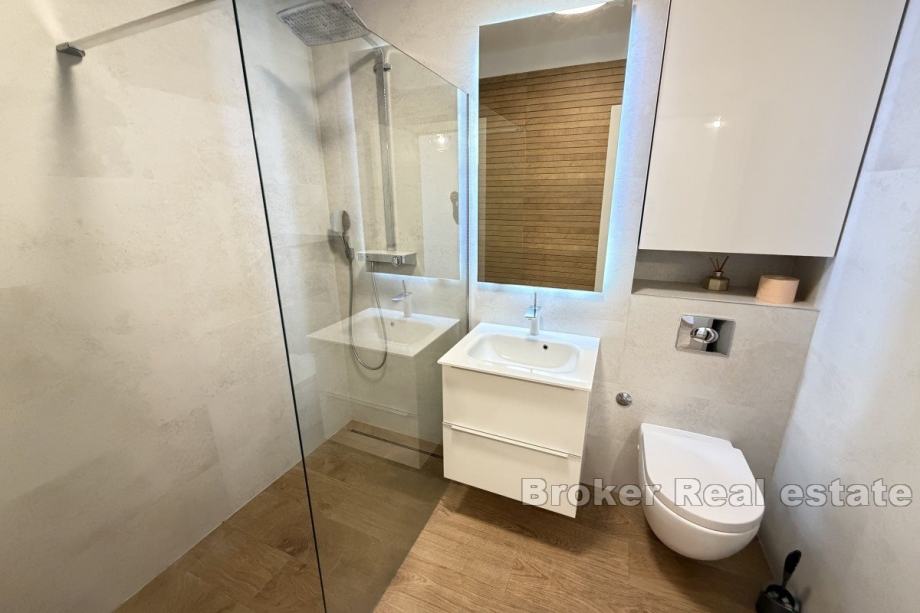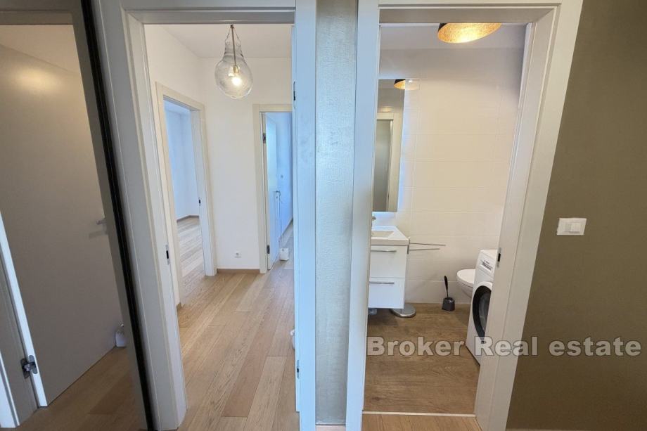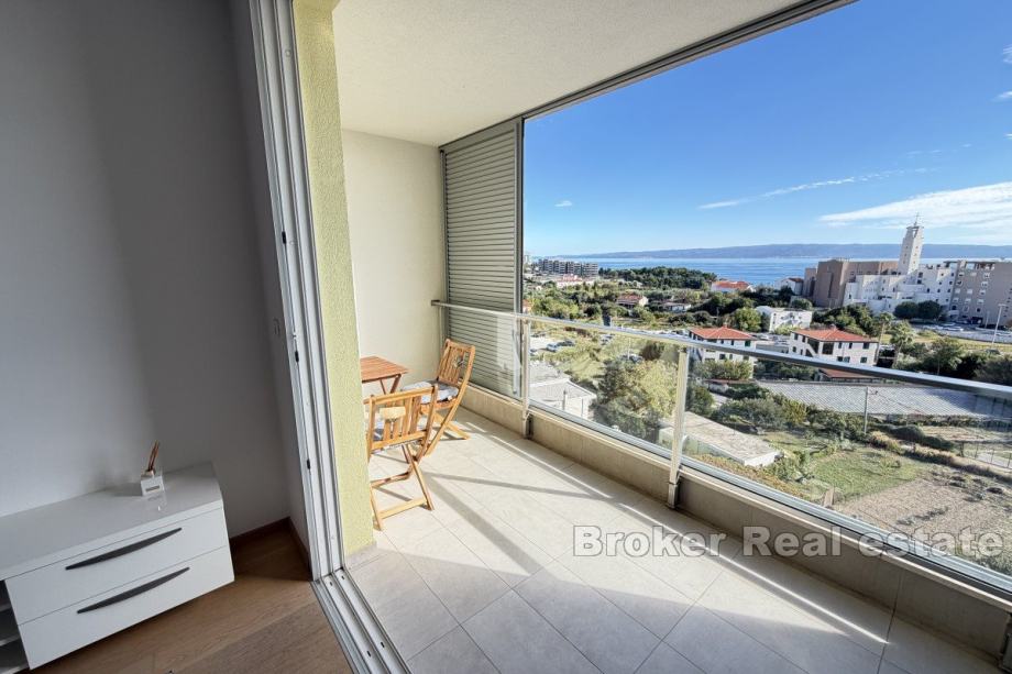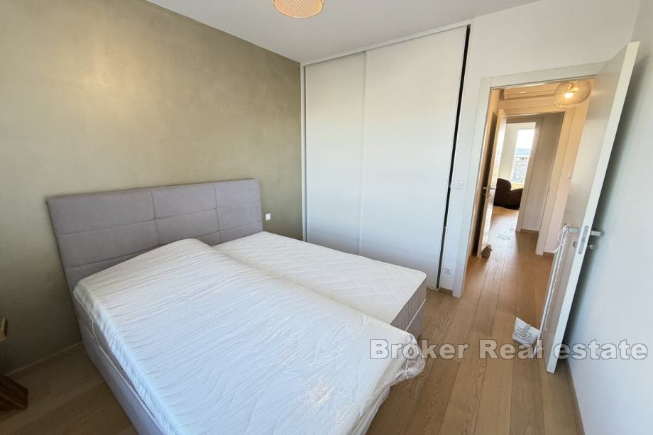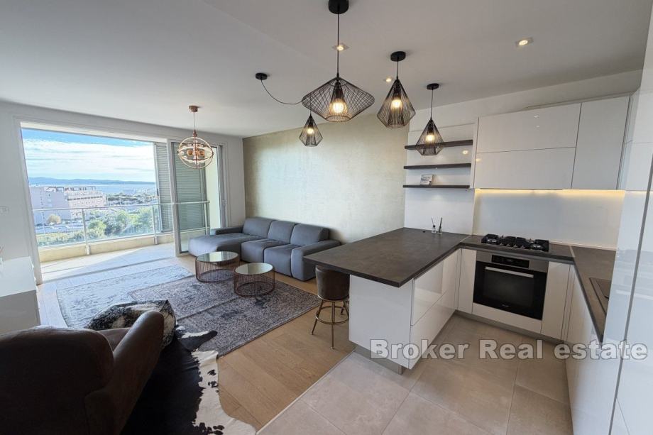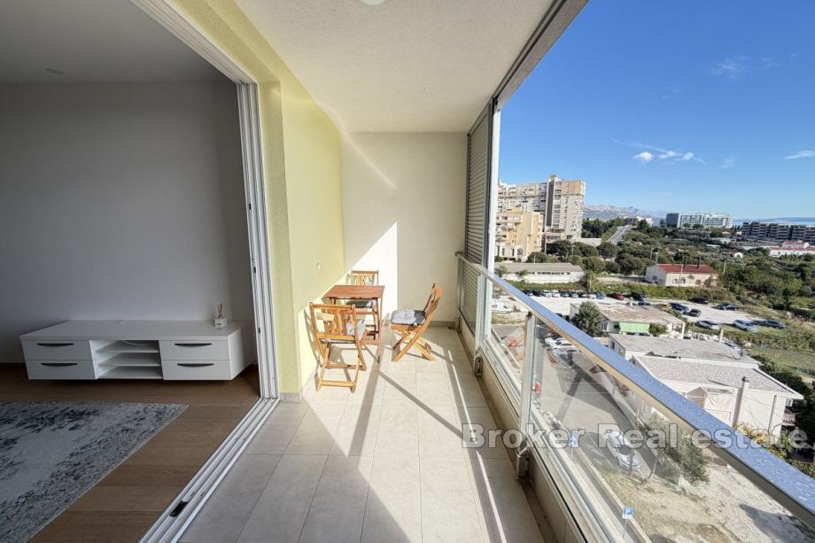 A beautiful, modernly furnished two-bedroom apartment with a total area of 76 m² is available for rent. It is located on a high floor of a building in a prestigious part of Split, in the Trstenik area, between two hospitals. The apartment is bright and airy, with an ideal north-south orientation. The southern side offers an open sea view and access to a spacious loggia of approximately 10 m², perfect for relaxing and enjoying the scenery.