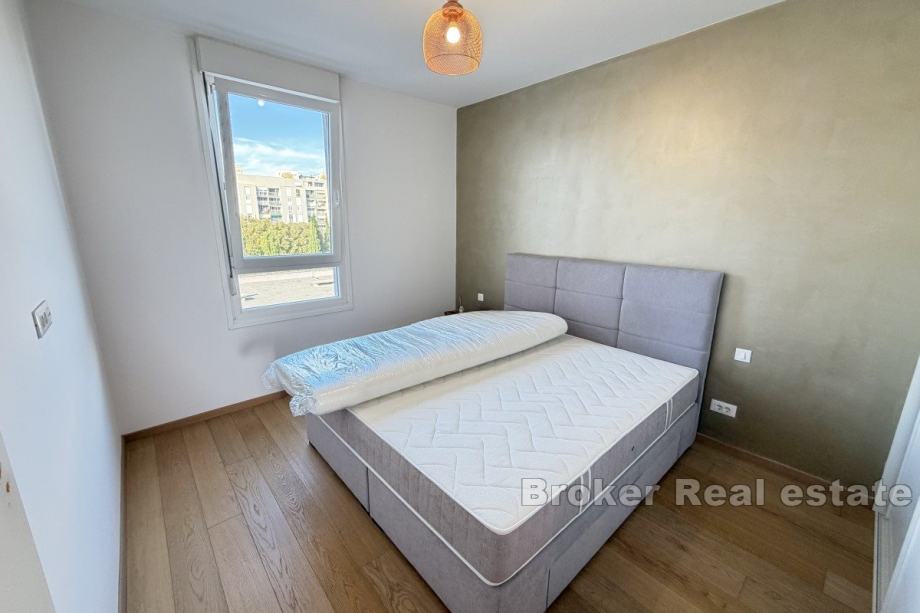 Iznajmljuje se prekrasan, moderno uređen dvosobni stan ukupne površine 76 m², smješten na visokom katu zgrade u prestižnom dijelu Splita, na lokaciji Trstenik, između dviju bolnica.