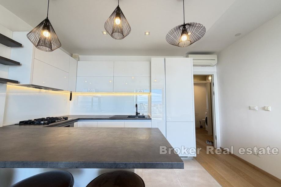 Stan je svijetao i prozračan, s idealnom sjeverno-južnom orijentacijom, a južna strana pruža otvoren pogled na more i izlaz na prostranu lođu od oko 10 m², savršenu za odmor i uživanje u pogledu.