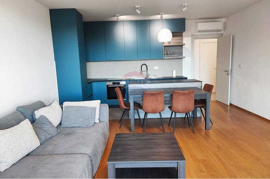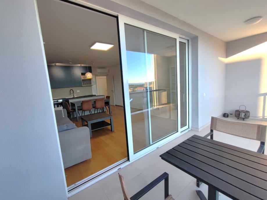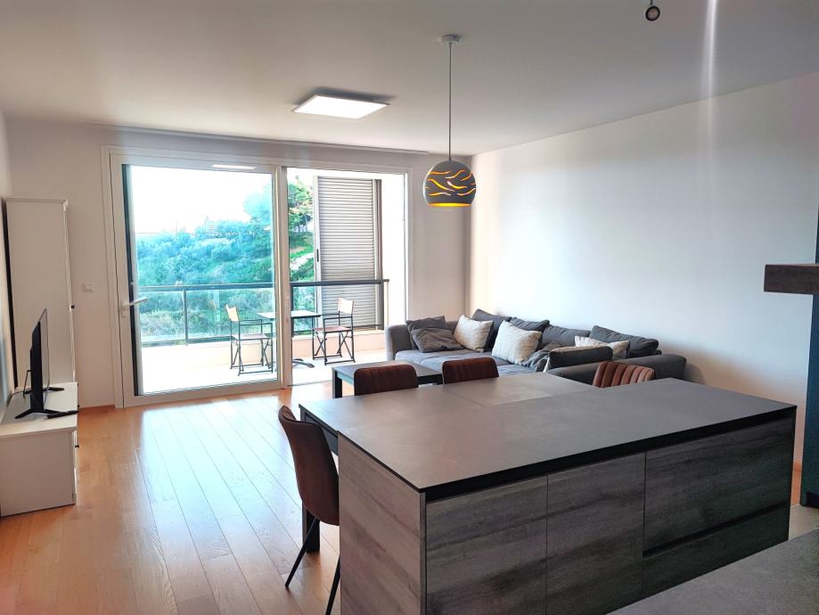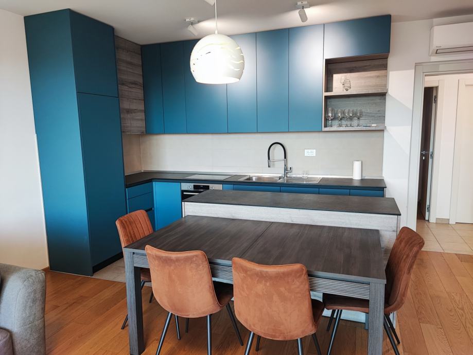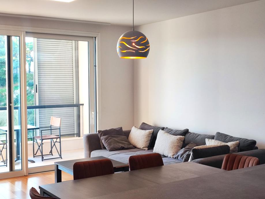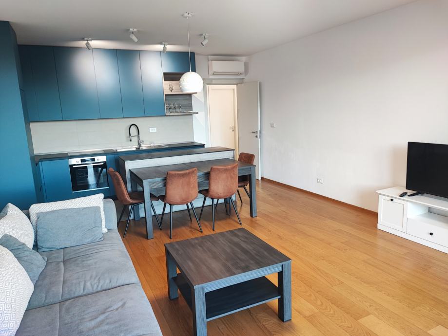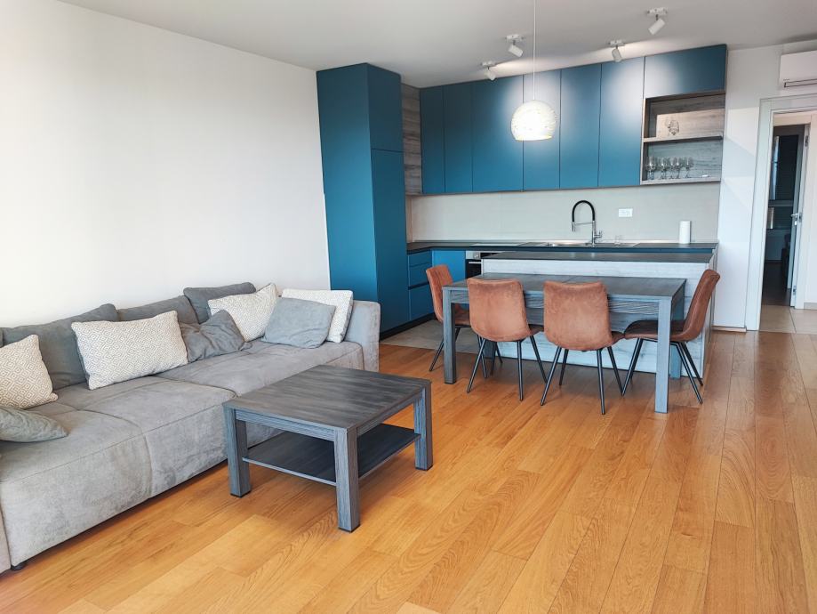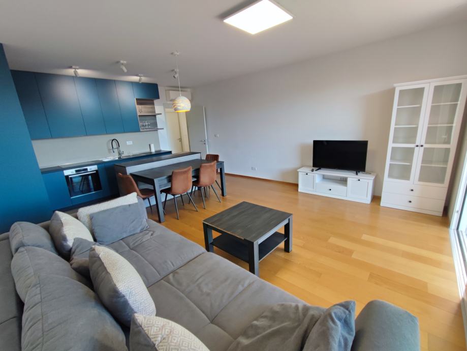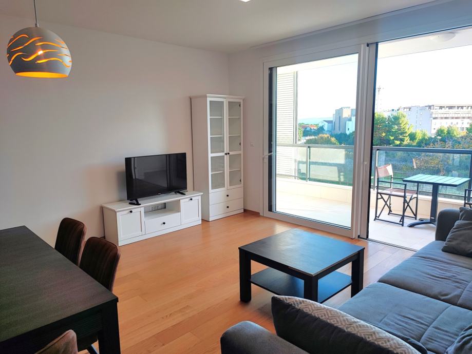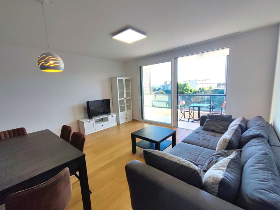 Nalazi se na 1. katu, podne površine 69,79 m2. Sastoji se od prekrasnog dnevnog boravka s blagovaonicom na jugu, površine 30 m2. Cijela južna strana stana je u kliznoj stijenci, sa izlazom na lođu površine 12 m.