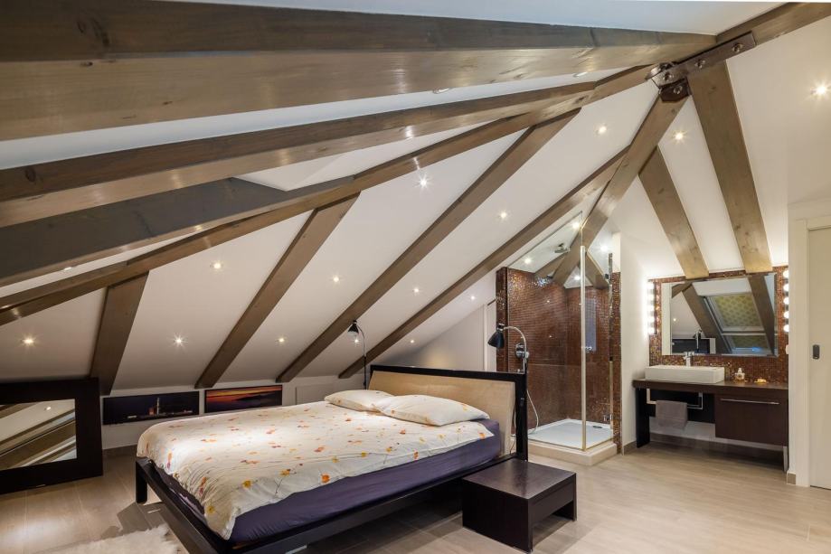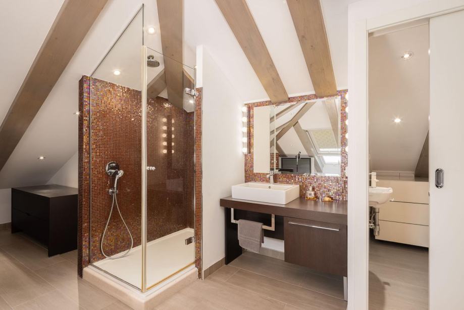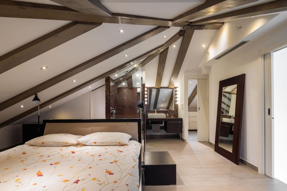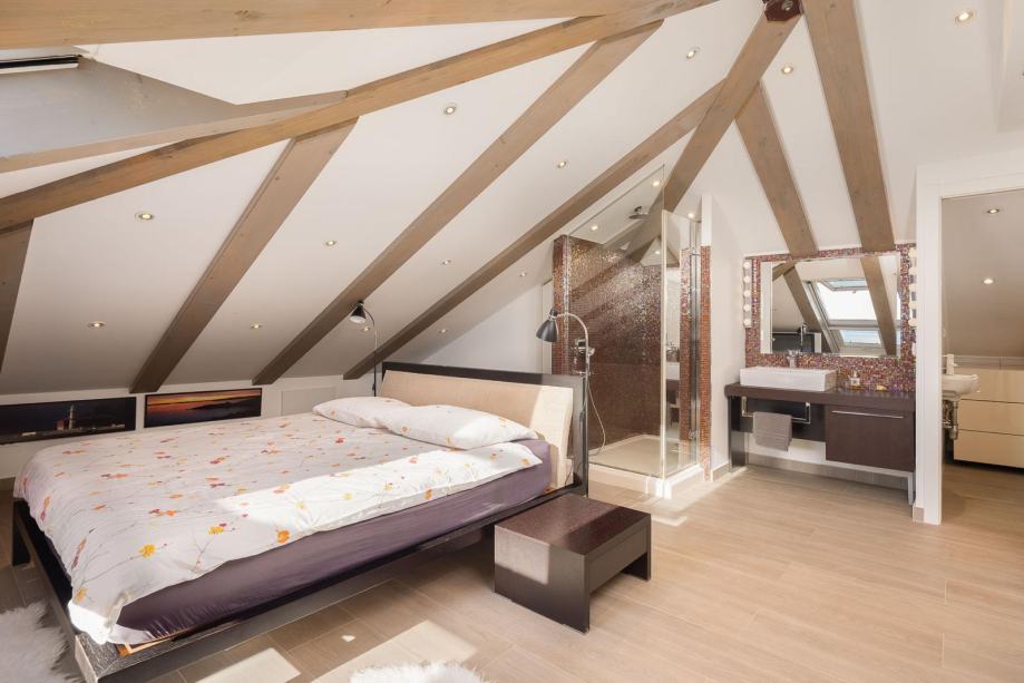 Sastoji se od ulaznog dijela, prostranog dnevnog boravka s kuhinjom i blagovaonicom, dvije spavaće sobe (jedna s vlastitim tušem i WC-om, druga s kupaonicom) te lođe s kaminom/roštiljem.