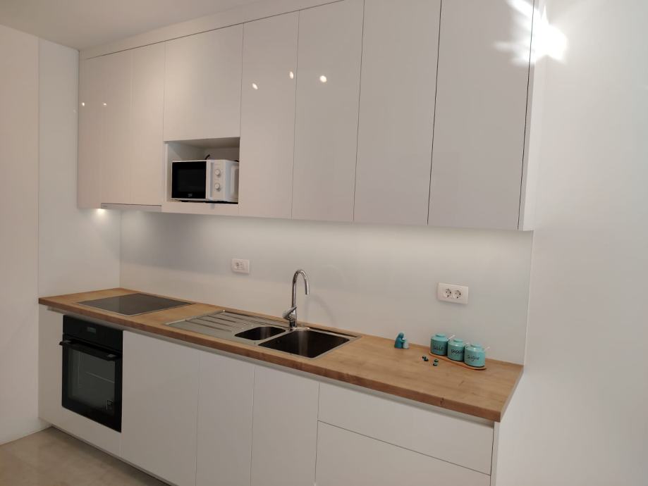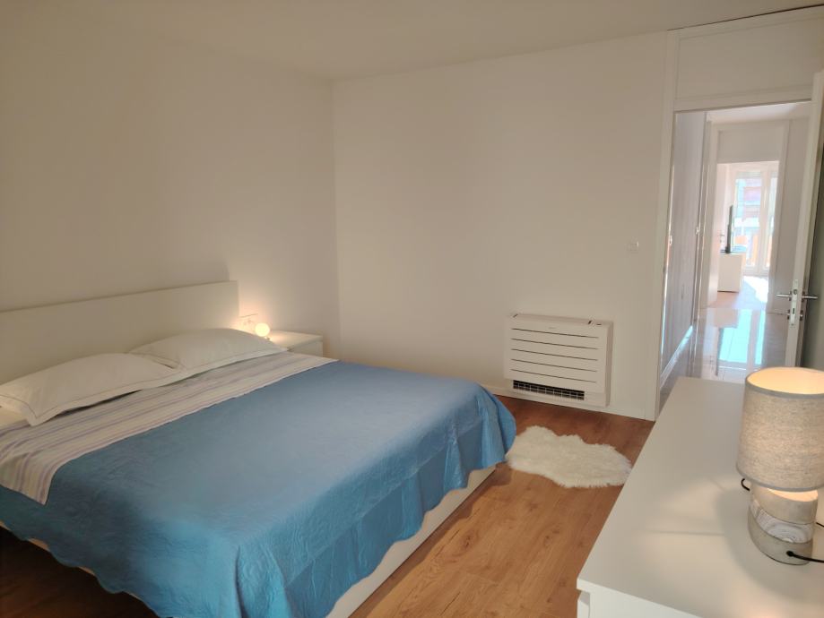 The apartment has been completely renovated — new installations, floors, tiles, two bathrooms, and new windows.