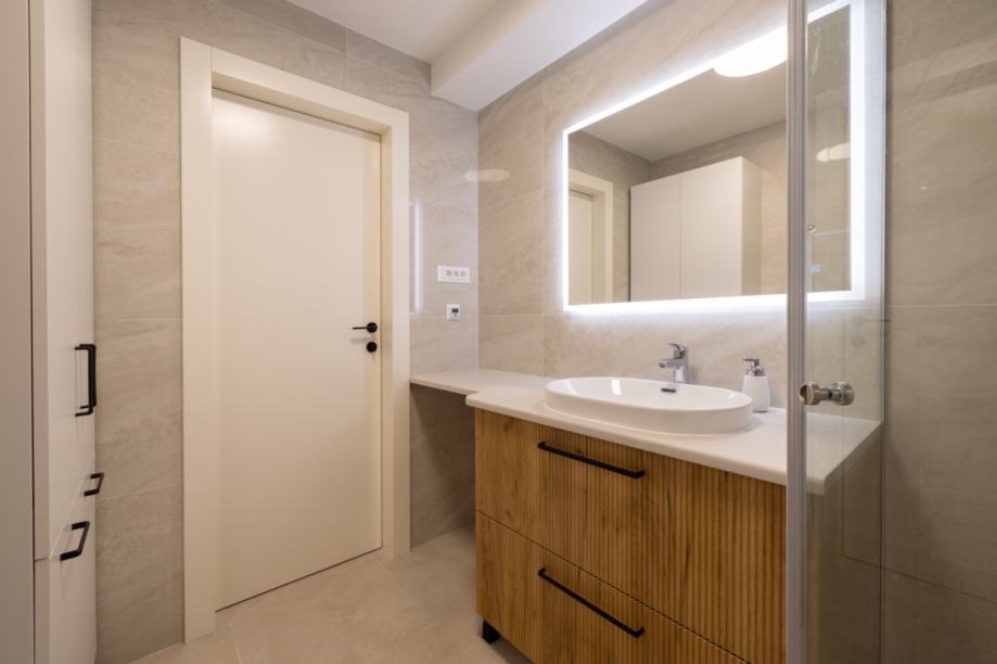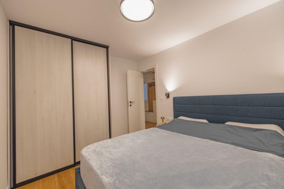 Stan se sastoji od dnevnog boravka, blagovaonice, kuhinje, dvije spavaće sobe, kupaonice, wc-a, nenatkrivene terase i natkrivene terase od 28 m2. Interijer je moderno uređen i kompletno namješten.