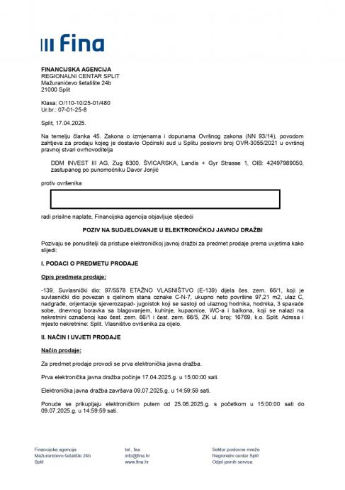 Prva elektronička javna dražba počinje 17.04.2025.g. u 15:00:00 sati.