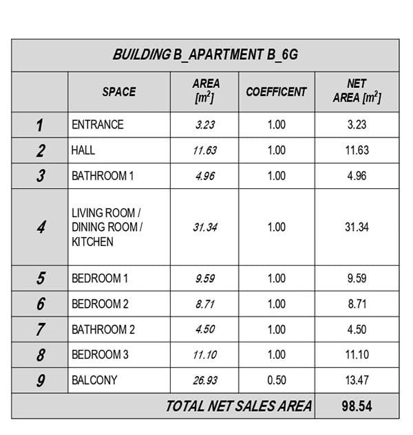 Stan B_6G se nalazi na 6. katu stambene zgrade B te je ukupne neto kvadrature - 98,54m2.