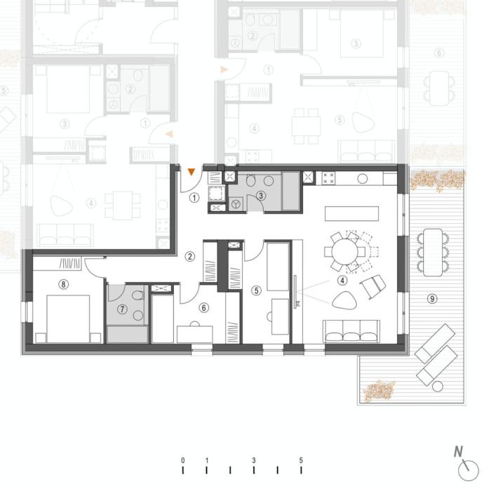 Sastoji se od prostranog otvorenog prostora kuhinje, blagovaonice i dnevnog boravka (31,34m2), tri spavaće sobe (11,10m2, 8,71m2 i 9,59m2), hodnika (14,86m2), dvije potpuno opremljene kupaonice (4,96m2 i 4,50m2) te natkrivenog balkona (26,63m2).