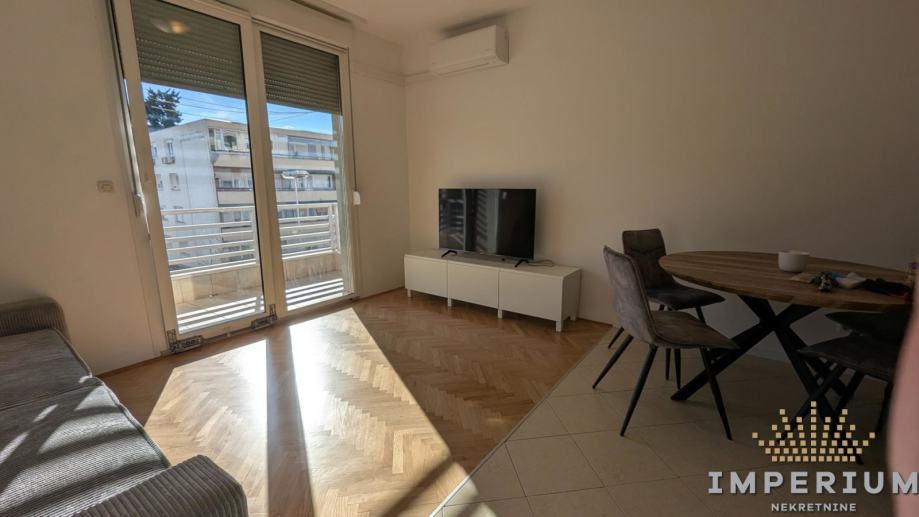 Stan se sastoji od ulaznog dijela, dnevnog boravka, kuhinje s blagavaonom, dvije spavaće sobe, kupaonice i balkona.