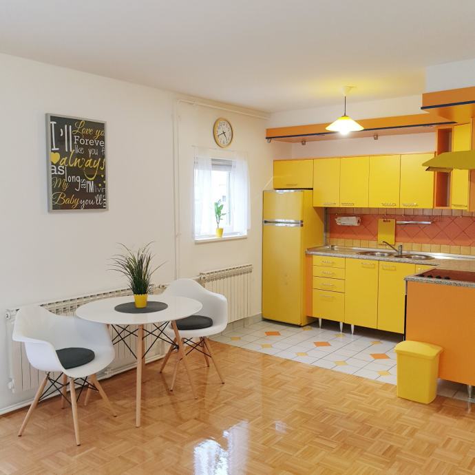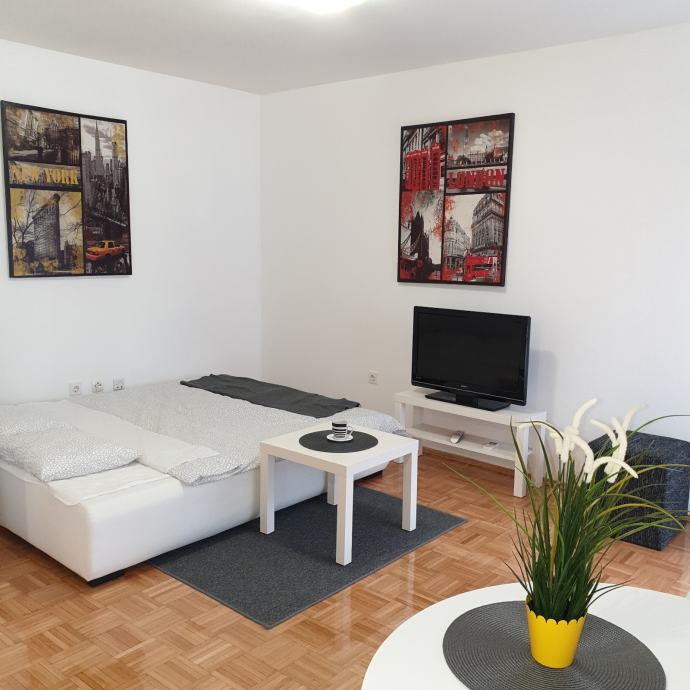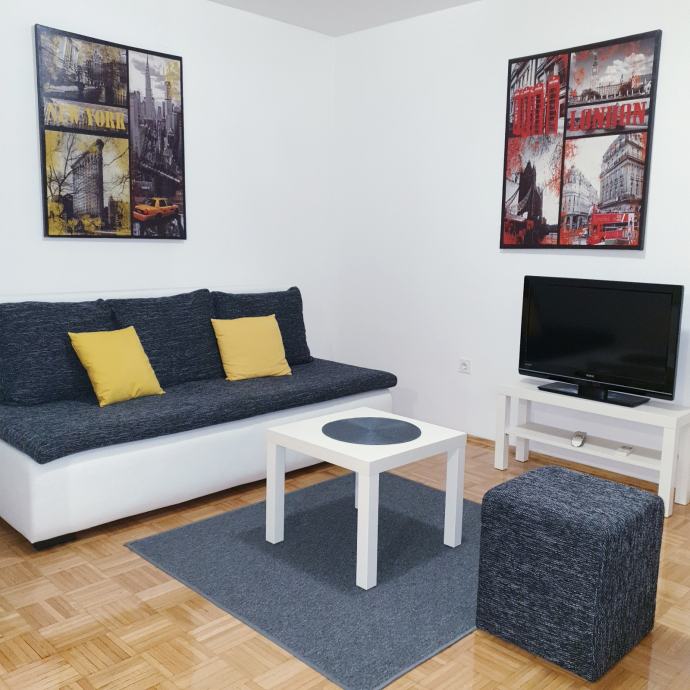 Iznajmljuje se potpuno opremljen jednosobni stan površine 35 m² na Srednjacima, u manjoj zgradi s liftom i videonadzorom. Uz stan dolazi vanjski parking pod rampom.
