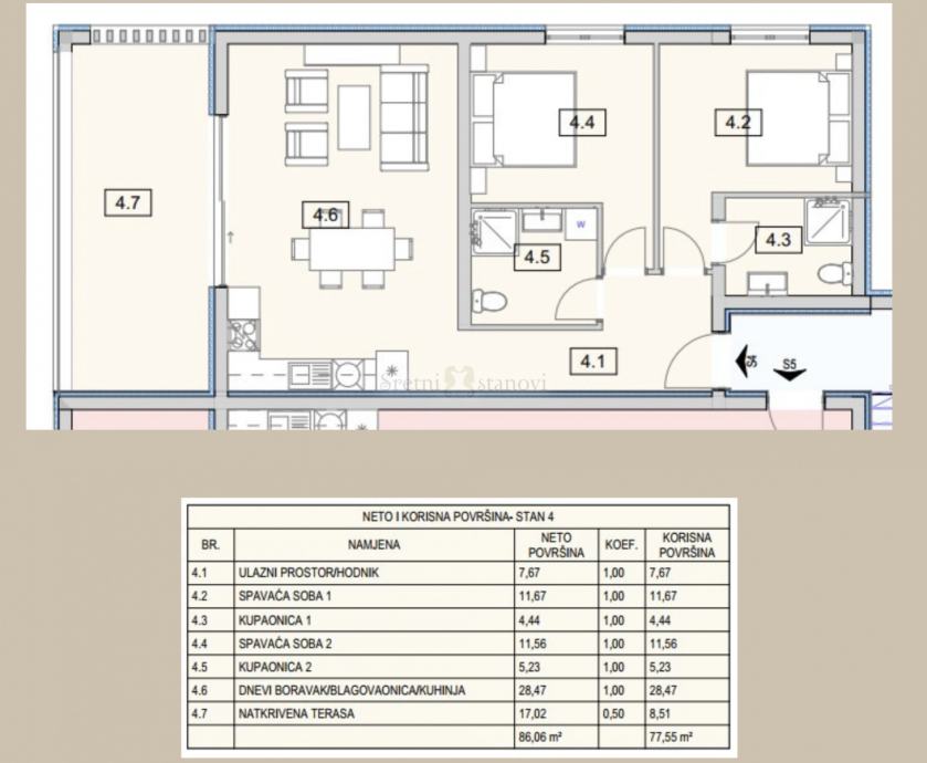 Ovaj stan se nalazi na 1. katu zgrade. Sastoji se od ulaznog hodnika, 2 spavaće sobe, 2 kupaone, dnevnog boravka s kuhinjom i blagovaonom i izlazom na veliku natkrivenu terasu s prekrasnim pogledom na more. Stanu pripada i vanjsko parkirno mjesto koje je u cijeni stana. Kupnja dodatnog parkirnog mjesta moguća je ovisno o trenutnoj dostupnosti.