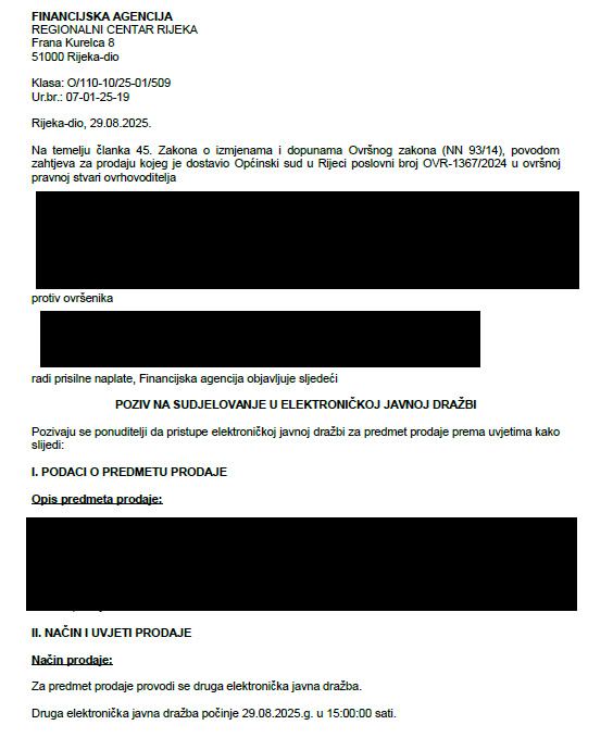 Druga elektronička javna dražba počinje 29.08.2025.g. u 15:00:00 sati.