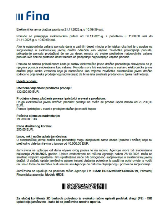 Elektronička javna dražba završava 21.11.2025.g. u 10:59:59 sati.