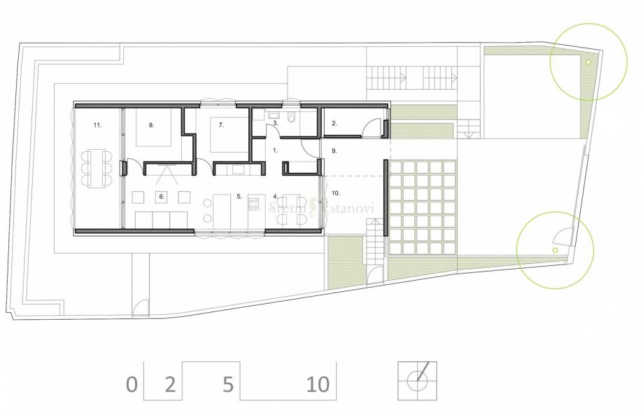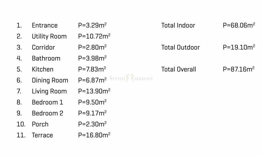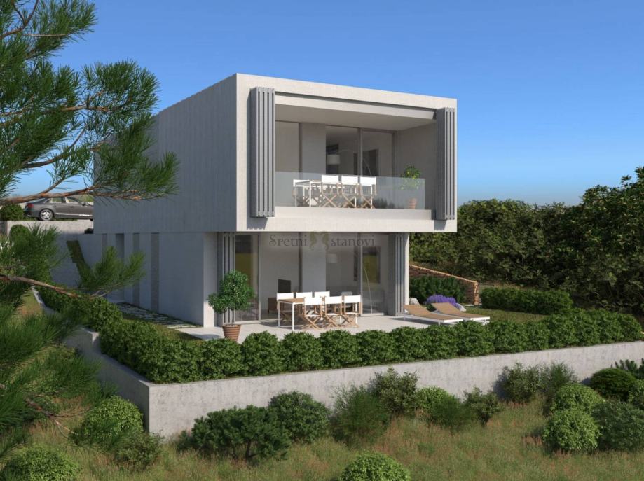 Stan se nalazi na 1. katu malene zgrade prizmlje + kat, s ukupno 2 stana, od kojih je svaki na jednome katu. Stan se sastoji od ulaznog hodnika, 2 spavaće sobe, kupaone i dnevnog boravka s kuhinjom i blagovaonom s izlazom na prekrasnu loggiu s pogledom na more. Stanu pripadaju i spremište koje se nalazi ispred ulaza u stan, a na djelomično natkrivenoj, privatnoj ulaznoj terasi, kao i dio uređenog vrta u okućnici zgrade te 2 vanjska parkirna mjesta.