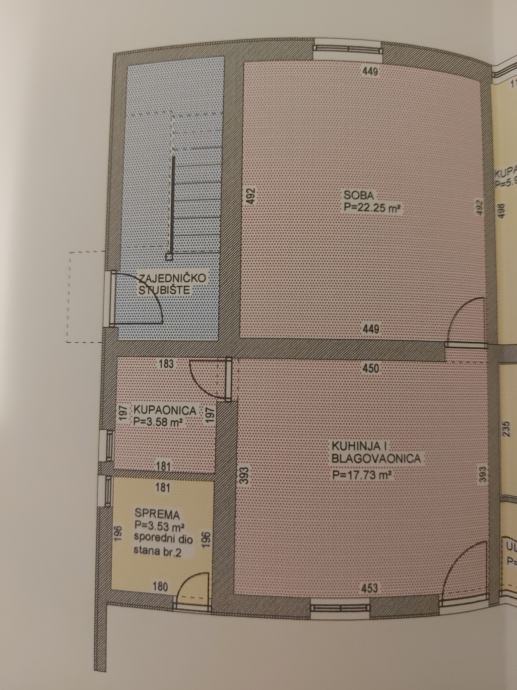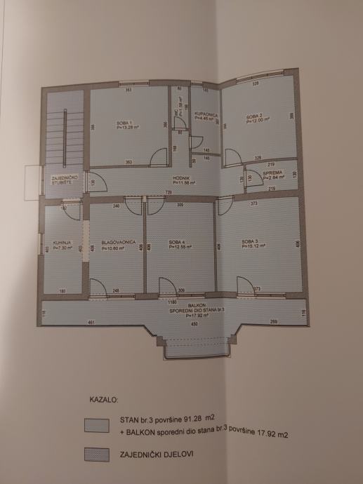 2.STAN - etaža 1.kat, podne površine 91,28m2, sastoji se od 4 sobe, kuhinje, blagovaonice, hodnika, kupaonice, wc-a i spreme. Kao sporedni dio stanu pripada balkon podne površine 17,92m2 i dvorište podne površine 46,42m2.