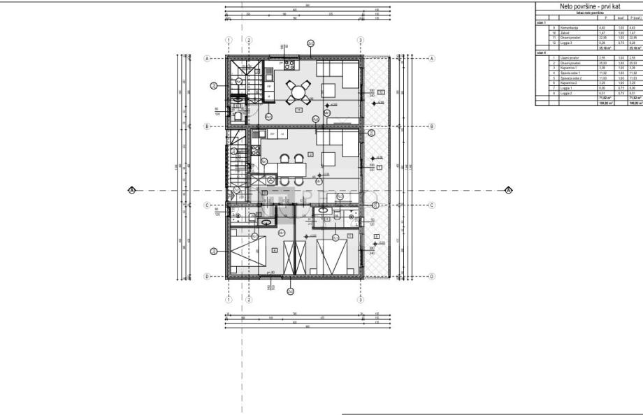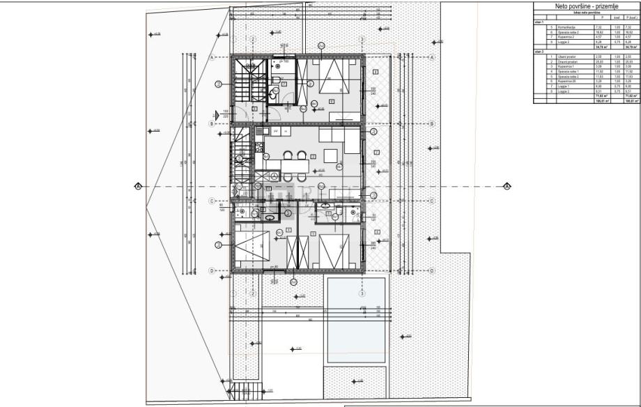 sobe s pripadajućom kupaonicom. Od vanjskih prostora stan sadrži dvije loggie.Stanu pripada i 60 m2 okućnice.Stan ima 1 parking mjesto.
