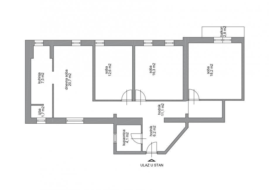 Stan se sastoji od ulaznog hodnika iz kojeg se ulazi u kupaonu s WC-om, te novog hodnika iz kojeg se ulazi u dnevnu sobu, kuhinju s izbom, te tri spavaće sobe, a iz zadnje sobe izlazi se na lijepi balkon s pogledom na Zagreb.