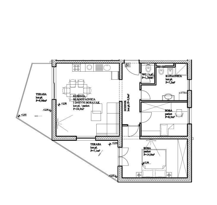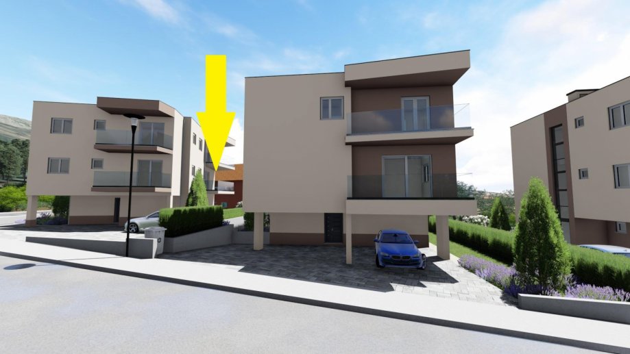 A two bedroom apartment of 73 sqm, located on the 1st floor, small building, newly built, consisted of two bedrooms, bathroom, toilet, open plan kitchen with dining and living area, two terraces, parking spot, in a quiet location few minutes drive from Split.