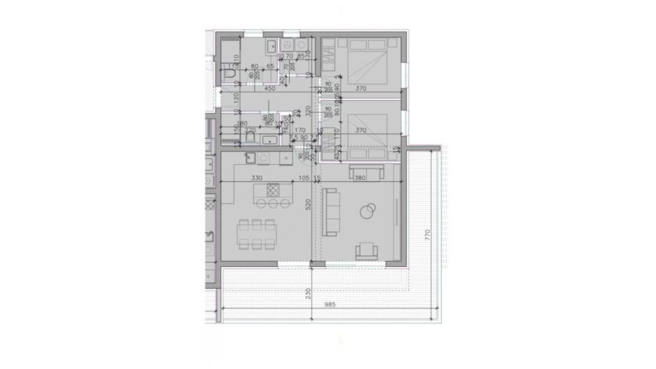 Stan se nalazi u prizemlju, ukupne neto korisne površine 96,6 m². Sastoji se od hodnika, dnevnog boravka s kuhinjom i blagovaonicom (open concept), 2 spavaće sobe, 2 kupaonice te terase površine 15 m².